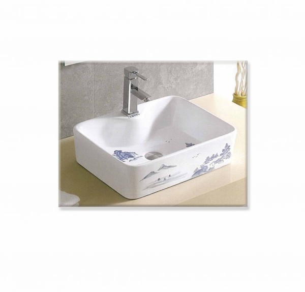 Νιπτήρας πορσελάνης λευκός με decor επικαθήμενος με οπή για τοποθέτηση μπαταρίας στο κέντρο χωρίς υπερχείλιση