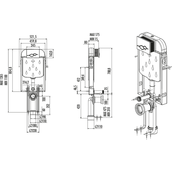 Επίτοιχη εγκατάσταση, στερέωση σε φέροντα τοίχο. Ρυθμιζόμενο ύψος σωλήνα τροφοδοσίας λεκάνης. Αθόρυβο φλοτέρ, με σύνδεση παροχής νερού εξωτερική για αποφυγή διαρροής.