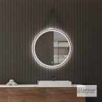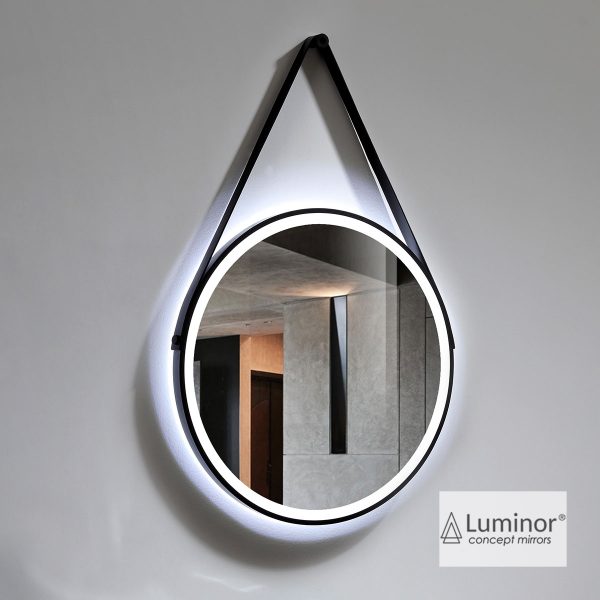 Καθρέπτης FLY, Φ80 εκ. φωτιζόμενος LED, με μαύρο πλαίσιο αλουμινίου, δερμάτινο ιμάντα και επιτοίχια βάση στήριξης, LUMINOR