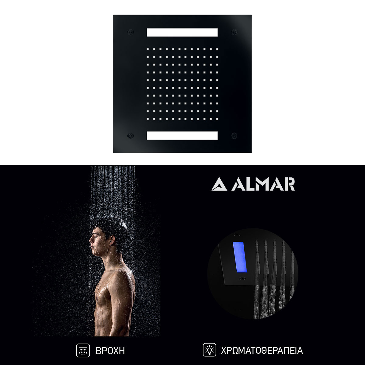 Κεφαλή Ντουζ Εντοιχισμού Οροφής 30×30 Με Χρωματοθεραπεία, Almar Black Matt