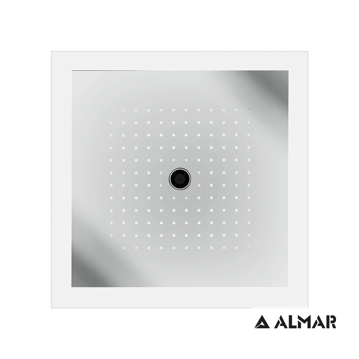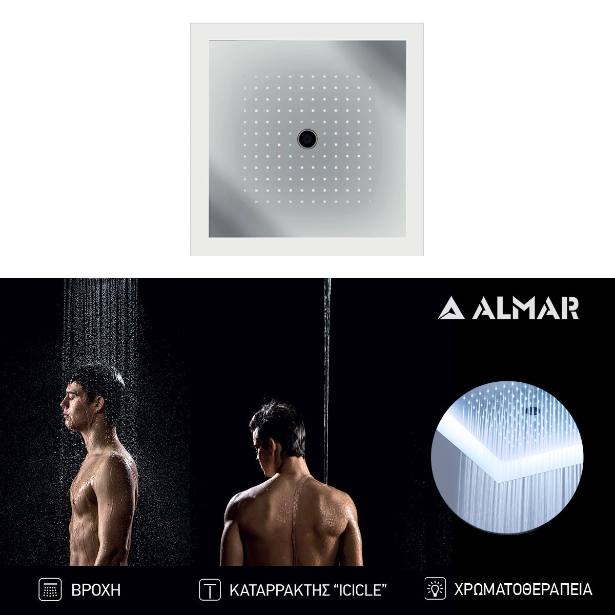 Κεφαλή ντους οροφής εντοιχισμού με χρωματοθεραπεία Icicle 47×47εκ. 2 ροών (βροχή ή καταρράκτης), με χρωματοθεραπεία & remote control, από ανοξείδωτο ατσάλι, Almar Ιταλίας