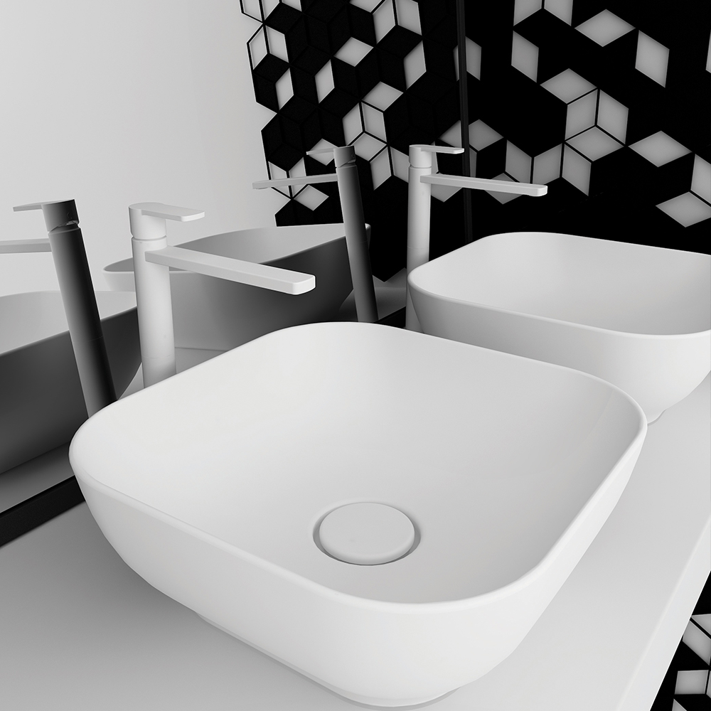Νιπτήρας χωρίς υπερχείλιση από λευκή γυαλιστερή ή λευκή, μαύρη, γκρι, καφέ-μπεζ, τιρκουάζ ματ πορσελάνη υψηλής ποιότητας. Διαστάσεις νιπτήρα 38Χ38 εκατοστά, με ύψος νιπτήρα 14.4 εκατοστά. Βάθος νιπτήρα 10.3 εκατοστά.