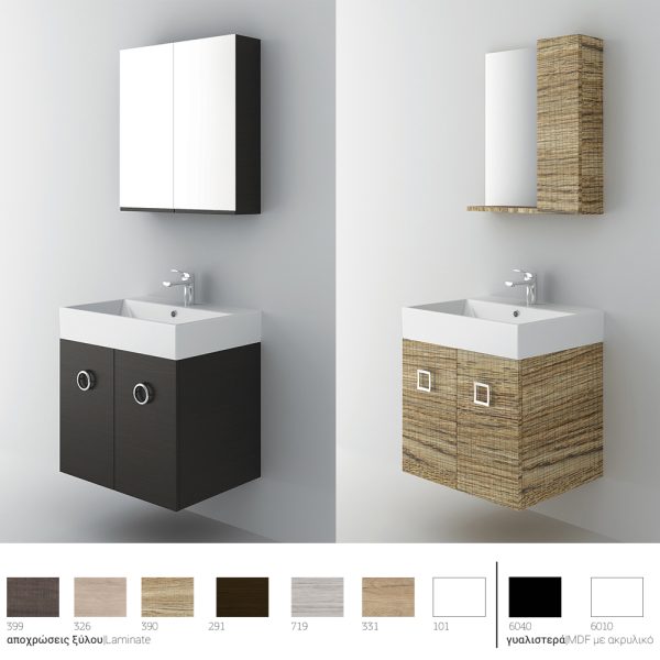 Κρεμαστό έπιπλο μπάνιου Amabile 60 – σειρά επίπλων Minimal. Ένα έπιπλο μπάνιου, βαρέως τύπου ιδανικό για οικιακή χρήση. Αποτελείται από, κρεμαστή βάση με δύο πόρτες με μηχανισμούς κλεισίματος soft close και νιπτήρα από πορσελάνη. Μπορείτε να ολοκληρώσετε την εικόνα του επίπλου προσθέτοντας καθρέπτη δικής σας επιλογής (ντουλάπι, εταζέρα με ντουλαπάκι ή καθρέπτη με πλαίσιο) και τα πόμολα που ταιριάζουν στο δικό σας μπάνιο. Όλα τα έπιπλα της εταιρείας Orabella μπορούν να πάρουν στήλες μπάνιου επιδαπέδιες ή κρεμαστές για επιπλέον χώρο αποθήκευσης, ενώ υπάρχει δυνατότητα προσθήκης ντουλαπιού πλυντηρίου σε χρώμα δικής σας επιλογής. Διατίθεται σε έξι διαφορετικές αποχρώσεις ξύλου και σε λευκό χρώμα-Laminate καθώς και σε μαύρο και λευκό γυαλιστερό και ματ ακρυλικό σε mdf. Κατόπιν επιλογής, μπορεί να συνοδευτεί με γραμμικό φωτιστικό μπάνιου Led.Υλικό επίπλου μελαμίνη με PVC για μεγαλύτερη αντοχή στο χρόνο και σε μεγάλη γκάμα χρωματικών επιλογών. Χρήση μηχανισμών κλεισίματος soft close, που φέρουν την υπογραφή της κορυφαίας εταιρείας BLUM. Διατίθεται με ντουλάπι καθρέπτη με δύο πόρτες ή με καθρέπτη εταζέρα που μπορεί να πλαισιωθεί από ένα πρόσθετο ντουλάπι 20 εκατοστών. Ο καθρέπτης Infinity αποτελεί μια τρίτη επιλογή χωρίς αποθηκευτικό χώρο. Ο τελευταίος βγαίνει μόνο σε αποχρώσεις ξύλου Laminate. Συμπεριλαμβάνονται στη βάση δύο, χρωμέ λαβές επίπλων, δικής σας επιλογής σε τρία σχέδια (M1, M4, M5). Ενώ υπάρχει δυνατότητα προσθήκης στο πακέτο μαύρων ματ γραμμικών λαβών, κατόπιν επιλογής (Μ1). Ομοίως μπορείτε να συνδυάσετε φωτιστικό επίπλου σε χρωμέ ή μαύρη απόχρωση. Η συνολική σύνθεση του επίπλου αποστέλλεται συναρμολογημένη σε 3 τεμάχια (βάση, νιπτήρας και καθρέπτης) και σε περίπτωση που επιλέξετε στήλες μπάνιου για να αυξήσετε τους αποθηκευτικούς χώρους στο μπάνιο σας, αυτές παραδίδονται συναρμολογημένες. Κατόπιν επιλογής, η σύνθεση μπορεί να συνοδευτεί με γραμμικό φωτιστικό μπάνιου Led 40 ή 60 εκατοστά ισχύος 8 και 12 watt αντιστοίχως, σε χρωμέ ή και μαύρο ματ χρώμα. Στην τιμή του νιπτήρα δεν συμπεριλαμβάνεται η μπαταρία και η βαλβίδα του νιπτήρα, μπορείτε να προσθέσετε ορειχάλκινη, βαλβίδα κλικ-κλακ για νιπτήρες με υπερχείλιση. Ομοίως μπορείτε να προσθέσετε μπαταρία νιπτήρος που φέρει την υπογραφή κορυφαίων εταιρειών στο σχεδιασμό ειδών υγιεινής, όπως Pentagono, Orabella by Armando Vicario και Orabella.