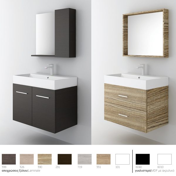Κρεμαστό έπιπλο μπάνιου Amabile 80 – σειρά επίπλων Minimal. Ένα έπιπλο μπάνιου, βαρέως τύπου ιδανικό για οικιακή χρήση. Αποτελείται από, κρεμαστή βάση με δύο πόρτες ή δύο συρτάρια με μηχανισμούς κλεισίματος soft close και νιπτήρα από πορσελάνη. Μπορείτε να ολοκληρώσετε την εικόνα του επίπλου προσθέτοντας καθρέπτη δικής σας επιλογής (ντουλάπι, εταζέρα με ντουλαπάκια ή καθρέπτη με πλαίσιο) και τα πόμολα που ταιριάζουν στο δικό σας μπάνιο. Όλα τα έπιπλα της εταιρείας Orabella μπορούν να πάρουν στήλες μπάνιου επιδαπέδιες ή κρεμαστές για επιπλέον χώρο αποθήκευσης, ενώ υπάρχει δυνατότητα προσθήκης ντουλαπιού πλυντηρίου σε χρώμα δικής σας επιλογής. Διατίθεται σε έξι διαφορετικές αποχρώσεις ξύλου και σε λευκό χρώμα-Laminate καθώς και σε μαύρο και λευκό γυαλιστερό ακρυλικό σε mdf. Κατόπιν επιλογής, μπορεί να συνοδευτεί με γραμμικό φωτιστικό μπάνιου Led.Υλικό επίπλου μελαμίνη με PVC για μεγαλύτερη αντοχή στο χρόνο και σε μεγάλη γκάμα χρωματικών επιλογών. Χρήση μηχανισμών κλεισίματος soft close και blumotion (σε συρτάρια) που φέρουν την υπογραφή της κορυφαίας εταιρείας BLUM. Διατίθεται με ντουλάπι καθρέπτη με δύο πόρτες ή με καθρέπτη εταζέρα που μπορεί να πλαισιωθεί από δύο πρόσθετα ντουλάπια 20 εκατοστών. Ο καθρέπτης Infinity αποτελεί μια τρίτη επιλογή χωρίς αποθηκευτικό χώρο. Ο τελευταίος βγαίνει μόνο σε αποχρώσεις ξύλου Laminate. Συμπεριλαμβάνονται στη βάση δύο χρωμέ λαβές επίπλων, δικής σας επιλογής σε τρία σχέδια, ανάλογα με τη μορφολογία της βάσης. Ενώ υπάρχει δυνατότητα προσθήκης στο πακέτο μαύρων ματ γραμμικών λαβών, κατόπιν επιλογής. Στην περίπτωση δύο συρταριών μπορείτε να επιλέξετε ανάμεσα στα πόμολα Μ1, Μ4 ή Μ5 ή σε μαύρο πόμολο M1. Σε βάση με δύο πόρτες μπορεί να τοποθετηθούν πόμολα χρωμέ, γραμμικά L1, L2 ή L3 ή μαύρο ματ L1. Ομοίως μπορείτε να συνδυάσετε φωτιστικό επίπλου σε χρωμέ ή μαύρη απόχρωση. Η συνολική σύνθεση του επίπλου αποστέλλεται συναρμολογημένη σε 3 τεμάχια (βάση, νιπτήρας και καθρέπτης) και σε περίπτωση που επιλέξετε στήλες μπάνιου για να αυξήσετε τους αποθηκευτικούς χώρους στο μπάνιο σας, αυτές παραδίδονται συναρμολογημένες. Κατόπιν επιλογής, η σύνθεση μπορεί να συνοδευτεί με γραμμικό φωτιστικό μπάνιου Led 40 ή 60 εκατοστά ισχύος 8 και 12 watt αντιστοίχως, σε χρωμέ ή και μαύρο ματ χρώμα. Στην τιμή του νιπτήρα δεν συμπεριλαμβάνεται η μπαταρία και η βαλβίδα του νιπτήρα, μπορείτε να προσθέσετε ορειχάλκινη, βαλβίδα κλικ-κλακ για νιπτήρες με υπερχείλιση. Ομοίως μπορείτε να προσθέσετε μπαταρία νιπτήρος που φέρει την υπογραφή κορυφαίων εταιρειών στο σχεδιασμό ειδών υγιεινής, όπως Pentagono, Orabella by Armando Vicario και Orabella.