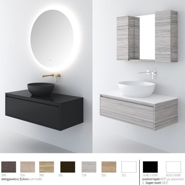 Υλικό επίπλου μελαμίνη με PVC ή mdf για μεγαλύτερη αντοχή στο χρόνο και σε μεγάλη γκάμα χρωματικών επιλογών. Χρήση μηχανισμών κλεισίματος soft close, που φέρουν την υπογραφή της κορυφαίας εταιρείας BLUM. Η συνολική σύνθεση του επίπλου αποστέλλεται συναρμολογημένη σε 3 τεμάχια (βάση, νιπτήρας και καθρέπτης) και σε περίπτωση που επιλέξετε στήλες μπάνιου για να αυξήσετε τους αποθηκευτικούς χώρους στο μπάνιο σας, αυτές παραδίδονται, επίσης, συναρμολογημένες. Κατόπιν επιλογής, η σύνθεση μπορεί να συνοδευτεί με γραμμικό φωτιστικό μπάνιου Led 40 ή 60 εκατοστά ισχύος 8 και 12 watt αντιστοίχως, σε χρωμέ ή και μαύρο ματ χρώμα. Ομοίως μπορείτε να προσθέσετε μπαταρία νιπτήρος και νιπτήρα δική σας επιλογής.