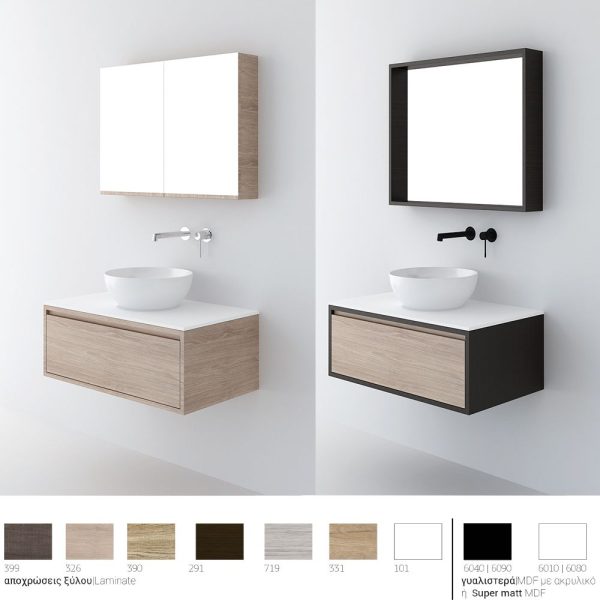 Υλικό επίπλου μελαμίνη με PVC ή mdf για μεγαλύτερη αντοχή στο χρόνο και σε μεγάλη γκάμα χρωματικών επιλογών. Χρήση μηχανισμών κλεισίματος soft close, που φέρουν την υπογραφή της κορυφαίας εταιρείας BLUM. Η συνολική σύνθεση του επίπλου αποστέλλεται συναρμολογημένη σε 3 τεμάχια (βάση, νιπτήρας και καθρέπτης) και σε περίπτωση που επιλέξετε στήλες μπάνιου για να αυξήσετε τους αποθηκευτικούς χώρους στο μπάνιο σας, αυτές παραδίδονται, επίσης, συναρμολογημένες. Κατόπιν επιλογής, η σύνθεση μπορεί να συνοδευτεί με γραμμικό φωτιστικό μπάνιου Led 40 ή 60 εκατοστά ισχύος 8 και 12 watt αντιστοίχως, σε χρωμέ ή και μαύρο ματ χρώμα. Ομοίως μπορείτε να προσθέσετε μπαταρία νιπτήρος και νιπτήρα δική σας επιλογής.