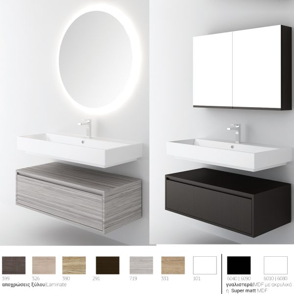 Υλικό επίπλου μελαμίνη με PVC ή mdf για μεγαλύτερη αντοχή στο χρόνο και σε μεγάλη γκάμα χρωματικών επιλογών. Χρήση μηχανισμών κλεισίματος soft close, που φέρουν την υπογραφή της κορυφαίας εταιρείας BLUM. Η συνολική σύνθεση του επίπλου αποστέλλεται συναρμολογημένη σε 3 τεμάχια (βάση, νιπτήρας και καθρέπτης) και σε περίπτωση που επιλέξετε στήλες μπάνιου για να αυξήσετε τους αποθηκευτικούς χώρους στο μπάνιο σας, αυτές παραδίδονται, επίσης, συναρμολογημένες. Κατόπιν επιλογής, η σύνθεση μπορεί να συνοδευτεί με γραμμικό φωτιστικό μπάνιου Led 40 ή 60 εκατοστά ισχύος 8 και 12 watt αντιστοίχως, σε χρωμέ ή και μαύρο ματ χρώμα. Ομοίως μπορείτε να προσθέσετε μπαταρία νιπτήρος δική σας επιλογής.