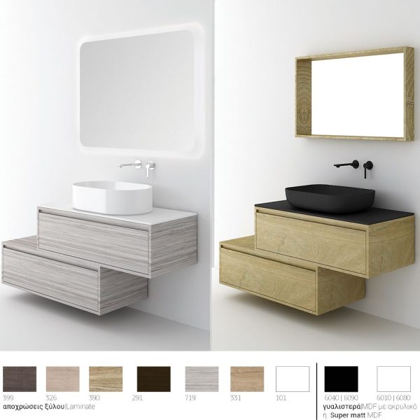 Κρεμαστό έπιπλο μπάνιου Drawer asymmetrical – σειρά επίπλων Drawer. Ένα έπιπλο μπάνιου, βαρέως τύπου ιδανικό για οικιακή χρήση. Αποτελείται από, κρεμαστή βάση με δύο συρτάρια με μηχανισμό κλεισίματος soft close (Blum) και επικάλυψη από ομοιογενές υλικό σε λευκό και HPL compact σε μαύρο. Διατίθεται σε τρείς διαστάσεις 60, 80 και 100 εκ. Μπορείτε να ολοκληρώσετε την εικόνα του επίπλου προσθέτοντας καθρέπτη δικής σας επιλογής (ντουλάπι, εταζέρα με ντουλαπάκι ή καθρέπτη με πλαίσιο ή καθρέπτη LED). Όλα τα έπιπλα της εταιρείας Orabella μπορούν να πάρουν στήλες μπάνιου επιδαπέδιες ή κρεμαστές για επιπλέον χώρο αποθήκευσης, ενώ υπάρχει δυνατότητα προσθήκης ντουλαπιού πλυντηρίου σε χρώμα δικής σας επιλογής. Διατίθεται σε έξι διαφορετικές αποχρώσεις ξύλου και σε λευκό χρώμα – Laminate καθώς και σε μαύρο και λευκό γυαλιστερό ή ματ mdf. Κατόπιν επιλογής, μπορεί να συνοδευτεί με γραμμικό φωτιστικό μπάνιου Led. Στην τιμή δεν περιλαμβάνεται ο νιπτήρας.