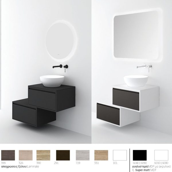 Κρεμαστό έπιπλο μπάνιου Drawer asymmetrical – σειρά επίπλων Drawer. Ένα έπιπλο μπάνιου, βαρέως τύπου ιδανικό για οικιακή χρήση. Αποτελείται από, κρεμαστή βάση με δύο συρτάρια με μηχανισμό κλεισίματος soft close (Blum) και επικάλυψη από ομοιογενές υλικό σε λευκό. Διατίθεται σε τρείς διαστάσεις 60, 80 και 100 εκ. Μπορείτε να ολοκληρώσετε την εικόνα του επίπλου προσθέτοντας καθρέπτη δικής σας επιλογής (ντουλάπι, εταζέρα με ντουλαπάκι ή καθρέπτη με πλαίσιο ή καθρέπτη LED). Όλα τα έπιπλα της εταιρείας Orabella μπορούν να πάρουν στήλες μπάνιου επιδαπέδιες ή κρεμαστές για επιπλέον χώρο αποθήκευσης, ενώ υπάρχει δυνατότητα προσθήκης ντουλαπιού πλυντηρίου σε χρώμα δικής σας επιλογής. Διατίθεται σε έξι διαφορετικές αποχρώσεις ξύλου και σε λευκό χρώμα – Laminate καθώς και σε μαύρο και λευκό γυαλιστερό ή ματ mdf. Κατόπιν επιλογής, μπορεί να συνοδευτεί με γραμμικό φωτιστικό μπάνιου Led. Στην τιμή δεν περιλαμβάνεται ο νιπτήρας.