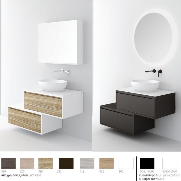 Κρεμαστό έπιπλο μπάνιου Drawer asymmetrical – σειρά επίπλων Drawer. Ένα έπιπλο μπάνιου, βαρέως τύπου ιδανικό για οικιακή χρήση. Αποτελείται από, κρεμαστή βάση με δύο συρτάρια με μηχανισμό κλεισίματος soft close (Blum) και επικάλυψη από ομοιογενές υλικό σε λευκό. Διατίθεται σε τρείς διαστάσεις 60, 80 και 100 εκ. Μπορείτε να ολοκληρώσετε την εικόνα του επίπλου προσθέτοντας καθρέπτη δικής σας επιλογής (ντουλάπι, εταζέρα με ντουλαπάκι ή καθρέπτη με πλαίσιο ή καθρέπτη LED). Όλα τα έπιπλα της εταιρείας Orabella μπορούν να πάρουν στήλες μπάνιου επιδαπέδιες ή κρεμαστές για επιπλέον χώρο αποθήκευσης, ενώ υπάρχει δυνατότητα προσθήκης ντουλαπιού πλυντηρίου σε χρώμα δικής σας επιλογής. Διατίθεται σε έξι διαφορετικές αποχρώσεις ξύλου και σε λευκό χρώμα – Laminate καθώς και σε μαύρο και λευκό γυαλιστερό ή ματ mdf. Κατόπιν επιλογής, μπορεί να συνοδευτεί με γραμμικό φωτιστικό μπάνιου Led. Στην τιμή δεν περιλαμβάνεται ο νιπτήρας.