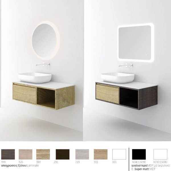Υλικό επίπλου μελαμίνη με PVC ή mdf για μεγαλύτερη αντοχή στο χρόνο και σε μεγάλη γκάμα χρωματικών επιλογών. Χρήση μηχανισμών κλεισίματος soft close, που φέρουν την υπογραφή της κορυφαίας εταιρείας BLUM. Η συνολική σύνθεση του επίπλου αποστέλλεται συναρμολογημένη σε 3 τεμάχια (βάση, νιπτήρας και καθρέπτης) και σε περίπτωση που επιλέξετε στήλες μπάνιου για να αυξήσετε τους αποθηκευτικούς χώρους στο μπάνιο σας, αυτές παραδίδονται, επίσης, συναρμολογημένες. Κατόπιν επιλογής, η σύνθεση μπορεί να συνοδευτεί με γραμμικό φωτιστικό μπάνιου Led 40 ή 60 εκατοστά ισχύος 8 και 12 watt αντιστοίχως, σε χρωμέ ή και μαύρο ματ χρώμα. Ομοίως μπορείτε να προσθέσετε μπαταρία νιπτήρος και νιπτήρα δική σας επιλογής.