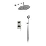 Μπαταρία λουτρού, εντοιχισμού, 2-σημείων χρωμέ με άριστη ποιότητα επινικέλωσης 5 στρωμάτων, που εγγυάται ευκολία στο καθάρισμα και λάμψη για πολλά χρόνια χρήσης και μπαταρία λουτρού σε μαύρο ματ φινίρισμα. Στρόγγυλος, επιτοίχιος βραχίονας κεφαλής ντουζ 30 εκ., με στρόγγυλη ροζέτα που κατασκευάζεται από υψηλής ποιότητας ορείχαλκο και κεφαλή ντουζ στρόγγυλη από ανοξείδωτο ατσάλι. Συνοδεύονται από επιτοίχια παροχή με στήριγμα τηλεφώνου από ορείχαλκο και μοντέρνο τηλέφωνο ντουζ με στρόγγυλη κεφαλή 3-θέσεων σετ με εύκαμπτο χρωμέ, ορειχάλκινο σπιράλ. Συνοδεύεται από 5-ετή γραπτή εργοστασιακή εγγύηση και υποστηρίζεται από πλήρη γκάμα ανταλλακτικών.