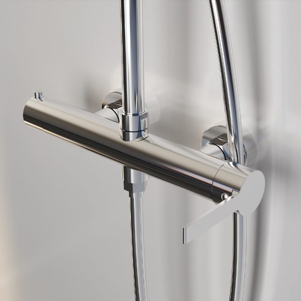 Στήλη ντουζ Elegance Column, ρυθμιζόμενου ύψους (81-118 cm) με κεφαλή από ανοξείδωτο ατσάλι, με ορειχάλκινη μπίλια Φ250. Ο διανομέας είναι κατασκευασμένος εξ ολοκλήρου από υψηλής ποιότητας ορείχαλκο. Συμπεριλαμβάνεται στήριγμά στον τοίχο ABS, τηλέφωνο 5-λειτουργιών και λείο σπιράλ τηλεφώνου (PVC) μήκους 150 εκατοστών. Διατίθεται σε χρωμέ και μαύρο ματ κατόπιν επιλογής.
