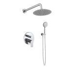 Μπαταρία λουτρού, εντοιχισμού, 2-σημείων με άριστη ποιότητα επινικέλωσης 5 στρωμάτων, που εγγυάται ευκολία στο καθάρισμα και λάμψη για πολλά χρόνια χρήσης. Στρόγγυλος, επιτοίχιος βραχίονας κεφαλής ντουζ 30 εκ., με στρόγγυλη ροζέτα που κατασκευάζεται από υψηλής ποιότητας ορείχαλκο και κεφαλή ντουζ στρόγγυλη από ανοξείδωτο ατσάλι. Συνοδεύονται από επιτοίχια παροχή με στήριγμα τηλεφώνου από ορείχαλκο και μοντέρνο τηλέφωνο ντουζ με στρόγγυλη κεφαλή 3-θέσεων, σε χρωμέ φινίρισμα σετ με εύκαμπτο χρωμέ, ορειχάλκινο σπιράλ. Συνοδεύεται από 5-ετή γραπτή εργοστασιακή εγγύηση και υποστηρίζεται από πλήρη γκάμα ανταλλακτικών.