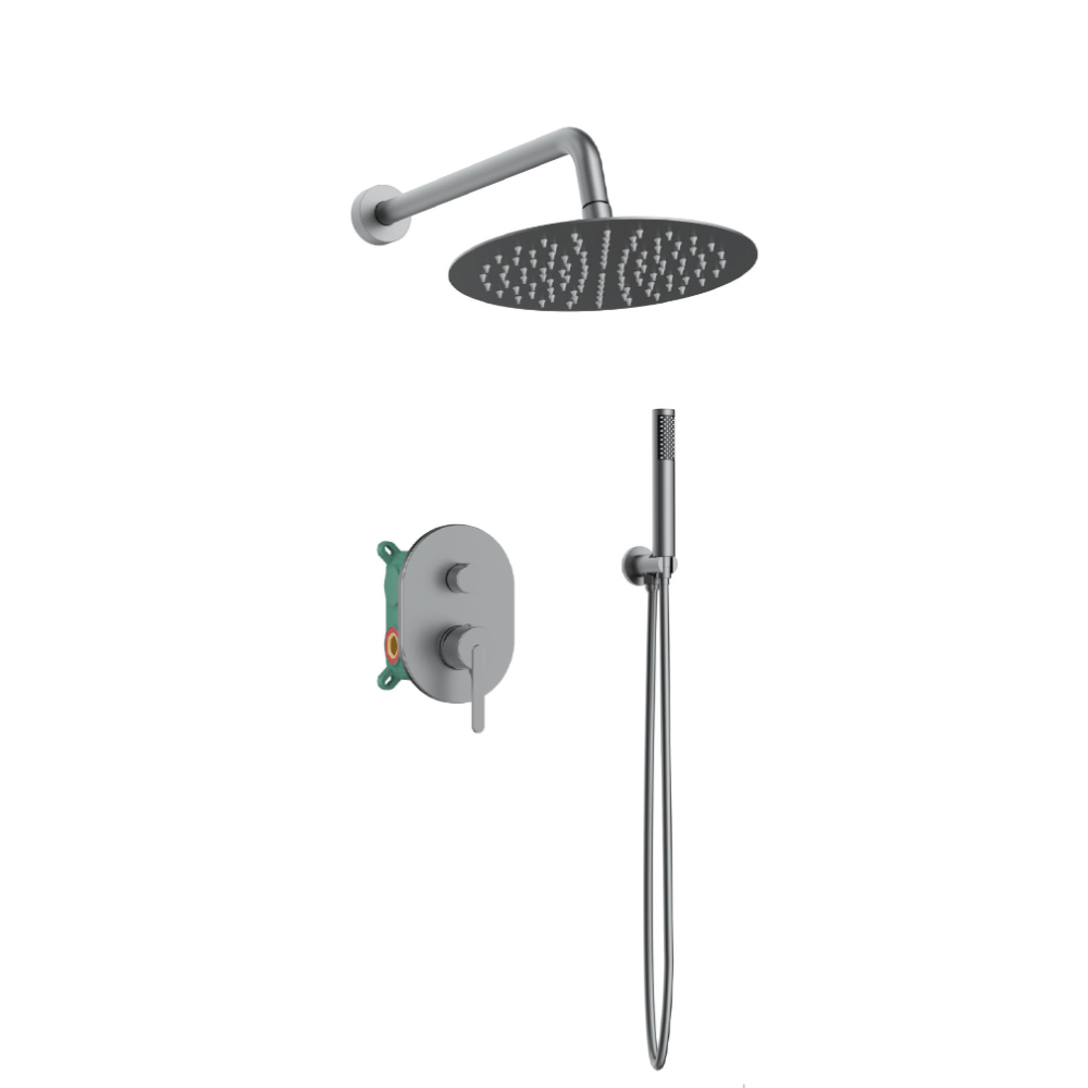 Orabella Marea Gun metal light – Shower set εντοιχισμού με Μπαταρία λουτρού, εντοιχισμού 2 σημείων, κεφαλή Φ250 με βραχίονα και τηλέφωνο ντουζ με σπιράλ και επιτοίχειο στήριγμα
