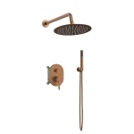 Orabella Marea Rose gold – Shower set εντοιχισμού με Μπαταρία λουτρού, εντοιχισμού 2 σημείων, κεφαλή Φ250 με βραχίονα και τηλέφωνο ντουζ με σπιράλ και επιτοίχειο στήριγμαΜπαταρία λουτρού, εντοιχισμού, 2-σημείων χρωμέ με άριστη ποιότητα επινικέλωσης 5 στρωμάτων, που εγγυάται ευκολία στο καθάρισμα και λάμψη για πολλά χρόνια. Στρόγγυλος, επιτοίχιος βραχίονας κεφαλής ντουζ 41 εκ., με στρόγγυλη ροζέτα που κατασκευάζεται από υψηλής ποιότητας ορείχαλκο και κεφαλή ντουζ στρόγγυλη Ø250 από ανοξείδωτο ατσάλι. Συνοδεύονται από επιτοίχια παροχή με στήριγμα τηλεφώνου από ορείχαλκο και μοντέρνο, μεταλλικό τηλέφωνο ντουζ σετ με εύκαμπτο ορειχάλκινο σπιράλ. Συνοδεύεται από 5-ετή γραπτή εργοστασιακή εγγύηση και υποστηρίζεται από πλήρη γκάμα ανταλλακτικών.