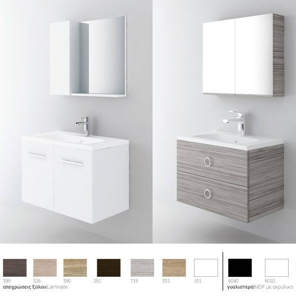 Κρεμαστό έπιπλο μπάνιου Mood 80 – σειρά επίπλων Slim. Ένα έπιπλο μπάνιου, βαρέως τύπου ιδανικό για οικιακή χρήση. Αποτελείται από, κρεμαστή βάση με δύο πόρτες ή δύο συρτάρια με μηχανισμούς κλεισίματος soft close και νιπτήρα από πορσελάνη. Η βάση διατίθεται και σε επιδαπέδια (Mood 80 Long). Μπορείτε να ολοκληρώσετε την εικόνα του επίπλου προσθέτοντας καθρέπτη δικής σας επιλογής (ντουλάπι, εταζέρα με ντουλαπάκια ή καθρέπτη με πλαίσιο) και τα πόμολα που ταιριάζουν στο δικό σας μπάνιο. Όλα τα έπιπλα της εταιρείας Orabella μπορούν να πάρουν στήλες μπάνιου επιδαπέδιες ή κρεμαστές για επιπλέον χώρο αποθήκευσης, ενώ υπάρχει δυνατότητα προσθήκης ντουλαπιού πλυντηρίου σε χρώμα δικής σας επιλογής. Διατίθεται σε έξι διαφορετικές αποχρώσεις ξύλου και σε λευκό χρώμα-Laminate καθώς και σε μαύρο και λευκό γυαλιστερό ακρυλικό σε mdf. Κατόπιν επιλογής, μπορεί να συνοδευτεί με γραμμικό φωτιστικό μπάνιου Led.Υλικό επίπλου μελαμίνη με PVC για μεγαλύτερη αντοχή στο χρόνο και σε μεγάλη γκάμα χρωματικών επιλογών. Χρήση μηχανισμών κλεισίματος soft close και blumotion (σε συρτάρια) που φέρουν την υπογραφή της κορυφαίας εταιρείας BLUM. Διατίθεται με ντουλάπι καθρέπτη με δύο πόρτες ή καθρέπτη με εταζέρα που μπορεί να πλαισιωθεί από δύο πρόσθετα ντουλάπια 20 εκατοστών. Ο καθρέπτης Infinity αποτελεί μια τρίτη επιλογή χωρίς αποθηκευτικό χώρο. Ο τελευταίος βγαίνει μόνο σε αποχρώσεις ξύλου Laminate. Συμπεριλαμβάνονται στη βάση δύο χρωμέ λαβές επίπλων, δικής σας επιλογής σε τρία σχέδια, ανάλογα με τη μορφολογία της βάσης. Ενώ υπάρχει δυνατότητα προσθήκης στο πακέτο μαύρων ματ γραμμικών λαβών κατόπιν επιλογής. Στην περίπτωση δύο συρταριών μπορείτε να επιλέξετε ανάμεσα στα πόμολα Μ1, Μ4 ή Μ5 ή σε μαύρο πόμολο M1. Σε βάση με δύο πόρτες μπορεί να τοποθετηθούν πόμολα χρωμέ, γραμμικά, L1, L2 ή L3 ή μαύρο ματ L1. Ομοίως μπορείτε να συνδυάσετε φωτιστικό επίπλου σε χρωμέ ή μαύρη απόχρωση. Η συνολική σύνθεση του επίπλου αποστέλλεται συναρμολογημένη σε 3 τεμάχια (βάση, νιπτήρας και καθρέφτη) και σε περίπτωση που επιλέξετε στήλες μπάνιου για να αυξήσετε τους αποθηκευτικούς χώρους στο μπάνιο σας, αυτές παραδίδονται συναρμολογημένες. Κατόπιν επιλογής, η σύνθεση μπορεί να συνοδευτεί με γραμμικό φωτιστικό μπάνιου Led 40 ή 60 εκατοστά ισχύος 8 και 12 watt αντιστοίχως, σε χρωμέ ή και μαύρο ματ χρώμα. Στην τιμή του νιπτήρα δεν συμπεριλαμβάνεται η μπαταρία και η βαλβίδα του νιπτήρα, μπορείτε να προσθέσετε ορειχάλκινη, βαλβίδα κλικ-κλακ για νιπτήρες με υπερχείλιση. Ομοίως μπορείτε να προσθέσετε μπαταρία νιπτήρος που φέρει την υπογραφή κορυφαίων εταιρειών στο σχεδιασμό ειδών υγιεινής, όπως Pentagono, Orabella by Armando Vicario και Orabella.