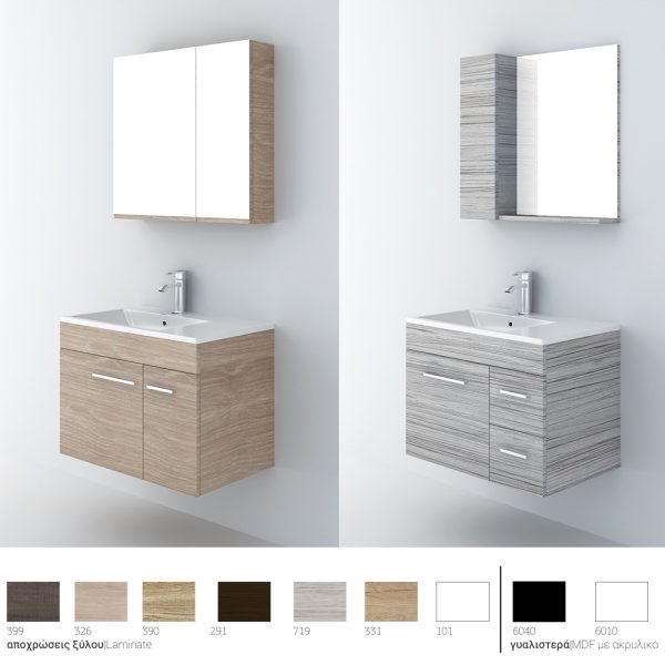 Κρεμαστό έπιπλο μπάνιου Raven 75 – σειρά επίπλων Slim. Ένα έπιπλο μπάνιου, βαρέως τύπου ιδανικό για οικιακή χρήση. Αποτελείται από, κρεμαστή βάση με δύο ασύμμετρες πόρτες ή μια πόρτα και δύο συρτάρια με μηχανισμούς κλεισίματος soft close και νιπτήρα από πορσελάνη. Μπορείτε να ολοκληρώσετε την εικόνα του επίπλου προσθέτοντας καθρέπτη δικής σας επιλογής (ντουλάπι ή εταζέρα με ντουλαπάκι) και τα πόμολα που ταιριάζουν στο δικό σας μπάνιο. Όλα τα έπιπλα της εταιρείας Orabella μπορούν να πάρουν στήλες μπάνιου επιδαπέδιες ή κρεμαστές για επιπλέον χώρο αποθήκευσης, ενώ υπάρχει δυνατότητα προσθήκης ντουλαπιού πλυντηρίου σε χρώμα δικής σας επιλογής. Διατίθεται σε έξι διαφορετικές αποχρώσεις ξύλου και σε λευκό χρώμα-Laminate καθώς και σε μαύρο και λευκό γυαλιστερό και ματ ακρυλικό σε mdf. Κατόπιν επιλογής, μπορεί να συνοδευτεί με γραμμικό φωτιστικό μπάνιου Led.Υλικό επίπλου μελαμίνη με PVC για μεγαλύτερη αντοχή στο χρόνο και σε μεγάλη γκάμα χρωματικών επιλογών. Χρήση μηχανισμών κλεισίματος soft close και blumotion (σε συρτάρια) που φέρουν την υπογραφή της κορυφαίας εταιρείας BLUM. Διατίθεται με ασύμμετρο ντουλάπι καθρέπτη με δύο πόρτες ή καθρέπτη εταζέρα που μπορεί να πλαισιωθεί από ένα πρόσθετο ντουλάπι 25 εκατοστών. Συμπεριλαμβάνονται στη βάση δύο ή τρείς, χρωμέ λαβές επίπλων (S1, L1). Ενώ υπάρχει δυνατότητα προσθήκης στο πακέτο μαύρων ματ γραμμικών λαβών κατόπιν επιλογής (S1, L1). Ομοίως μπορείτε να συνδυάσετε φωτιστικό επίπλου σε χρωμέ ή μαύρη απόχρωση. Η συνολική σύνθεση του επίπλου αποστέλλεται συναρμολογημένη σε 3 τεμάχια (βάση, νιπτήρας και καθρέπτης) και σε περίπτωση που επιλέξετε στήλες μπάνιου για να αυξήσετε τους αποθηκευτικούς χώρους στο μπάνιο σας, αυτές παραδίδονται συναρμολογημένες. Κατόπιν επιλογής, η σύνθεση μπορεί να συνοδευτεί με γραμμικό φωτιστικό μπάνιου Led 40 ή 60 εκατοστά ισχύος 8 και 12 watt αντιστοίχως, σε χρωμέ ή και μαύρο ματ χρώμα. Στην τιμή του νιπτήρα δεν συμπεριλαμβάνεται η μπαταρία και η βαλβίδα του νιπτήρα, μπορείτε να προσθέσετε ορειχάλκινη, βαλβίδα κλικ-κλακ για νιπτήρες με υπερχείλιση. Ομοίως μπορείτε να προσθέσετε μπαταρία νιπτήρος που φέρει την υπογραφή κορυφαίων εταιρειών στο σχεδιασμό ειδών υγιεινής, όπως Pentagono, Orabella by Armando Vicario και Orabella.