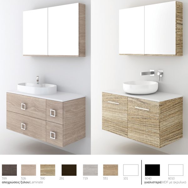 Κρεμαστό έπιπλο μπάνιου Solid Surface 100 – σειρά επίπλων Solid Surface. Ένα έπιπλο μπάνιου, βαρέως τύπου ιδανικό για οικιακή χρήση. Αποτελείται από, κρεμαστή βάση με δύο πόρτες ή δύο πόρτες και δύο συρτάρια ή τέσσερα συρτάρια ή μια πόρτα και δύο συρτάρια, με μηχανισμούς κλεισίματος soft close και 1.2 εκατοστά λευκό, ομοιογενές υλικό πάγκου. Μπορείτε να ολοκληρώσετε την εικόνα του επίπλου προσθέτοντας επικαθήμενο νιπτήρα και καθρέπτη δικής σας επιλογής (ντουλάπι, εταζέρα με ντουλαπάκια ή καθρέπτη με πλαίσιο) και τα πόμολα που ταιριάζουν στο δικό σας μπάνιο. Όλα τα έπιπλα της εταιρείας Orabella μπορούν να πάρουν στήλες μπάνιου επιδαπέδιες ή κρεμαστές για επιπλέον χώρο αποθήκευσης, ενώ υπάρχει δυνατότητα προσθήκης ντουλαπιού πλυντηρίου σε χρώμα δικής σας επιλογής. Διατίθεται σε έξι διαφορετικές αποχρώσεις ξύλου και σε λευκό χρώμα-Laminate καθώς και σε μαύρο και λευκό γυαλιστερό ακρυλικό σε mdf. Κατόπιν επιλογής, μπορεί να συνοδευτεί με γραμμικό φωτιστικό μπάνιου Led.Υλικό επίπλου μελαμίνη με PVC για μεγαλύτερη αντοχή στο χρόνο και σε μεγάλη γκάμα χρωματικών επιλογών. Χρήση μηχανισμών κλεισίματος soft close και blumotion (σε συρτάρια) που φέρουν την υπογραφή της κορυφαίας εταιρείας BLUM. Διατίθεται με ντουλάπι καθρέπτη με δύο πόρτες ή με καθρέπτη εταζέρα που μπορεί να πλαισιωθεί από δύο πρόσθετα ντουλάπια 25 εκατοστών. Ο καθρέπτης Infinity αποτελεί μια τρίτη επιλογή χωρίς αποθηκευτικό χώρο. Ο τελευταίος βγαίνει μόνο σε αποχρώσεις ξύλου Laminate. Συμπεριλαμβάνονται στη βάση δύο, τρείς ή τέσσερεις, χρωμέ λαβές επίπλων, δικής σας επιλογής σε τρία σχέδια, ανάλογα με τη μορφολογία της βάσης. Ενώ υπάρχει δυνατότητα προσθήκης στο πακέτο μαύρων ματ γραμμικών λαβών, κατόπιν επιλογής. Στην περίπτωση τεσσάρων συρταριών ή μιας πόρτας και δύο συρταριών μπορείτε να επιλέξετε ανάμεσα στα πόμολα Μ1, Μ4 ή Μ5 ή σε μαύρο πόμολο M1. Σε βάση με δύο πόρτες μπορεί να τοποθετηθούν πόμολα χρωμέ, γραμμικά, L1, L2 ή L3 ή μαύρο ματ L1. Και τέλος στην περίπτωση βάσης με δύο πόρτες – δύο συρτάρια τα πόμολα σε χρωμέ απόχρωση είναι φιξαρισμένα, γραμμικά (S1,M1) αλλά μπορείτε να αλλάξετε την εικόνα του επίπλου σας προσθέτοντας μαύρα ματ πόμολα (S1,M1). Ομοίως μπορείτε να συνδυάσετε φωτιστικό επίπλου σε χρωμέ ή μαύρη απόχρωση. Η συνολική σύνθεση του επίπλου αποστέλλεται συναρμολογημένη σε 3 τεμάχια (βάση, νιπτήρας και καθρέπτης) και σε περίπτωση που επιλέξετε στήλες μπάνιου για να αυξήσετε τους αποθηκευτικούς χώρους στο μπάνιο σας, αυτές παραδίδονται συναρμολογημένες. Κατόπιν επιλογής, η σύνθεση μπορεί να συνοδευτεί με γραμμικό φωτιστικό μπάνιου Led 40 ή 60 εκατοστά ισχύος 8 και 12 watt αντιστοίχως, σε χρωμέ ή και μαύρο ματ χρώμα. Στην τιμή δεν συμπεριλαμβάνεται ο νιπτήρας, η μπαταρία και η βαλβίδα του νιπτήρα, μπορείτε να προσθέσετε επικαθήμενο νιπτήρα και ορειχάλκινη βαλβίδα κλικ-κλακ για νιπτήρες χωρίς υπερχείλιση. Ομοίως μπορείτε να προσθέσετε μπαταρία νιπτήρος που φέρει την υπογραφή κορυφαίων εταιρειών στο σχεδιασμό ειδών υγιεινής, όπως Pentagono, Orabella by Armando Vicario και Orabella. Προσοχή: οι επικαλύψεις παραδίδονται ατρύπητες.