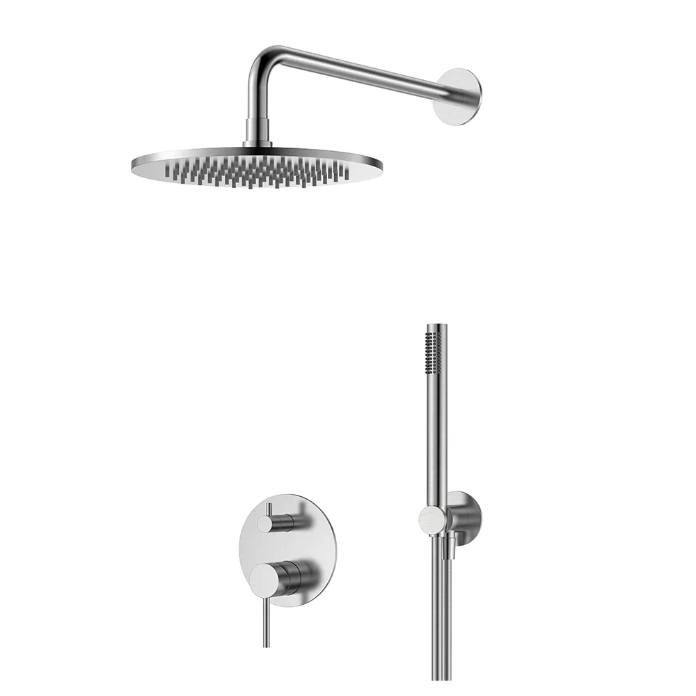 Μπαταρία λουτρού, εντοιχισμού, 2-σημείων απο ανοξείδωτο ατσάλι 316, που εγγυάται πολλά χρόνια χρήσης. Στρόγγυλος, επιτοίχιος βραχίονας κεφαλής ντουζ 35 εκ., με στρόγγυλη ροζέτα που κατασκευάζεται από υψηλής ποιότητας απο ανοξείδωτο ατσάλι και κεφαλή ντουζ στρόγγυλη Ø250 από ανοξείδωτο ατσάλι 316. Συνοδεύονται από επιτοίχια παροχή με στήριγμα τηλεφώνου από ορείχαλκο και μοντέρνο, μεταλλικό τηλέφωνο ντουζ, σετ με εύκαμπτο ορειχάλκινο σπιράλ. Συνοδεύεται από 5-ετή γραπτή εργοστασιακή εγγύηση και υποστηρίζεται από πλήρη γκάμα ανταλλακτικών.