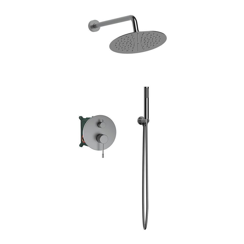 Orabella Terra Gun Metal Light – Shower Set Εντοιχισμού Με Μπαταρία Λουτρού, Εντοιχισμού 2 Σημείων, Κεφαλή Φ250 Με Βραχίονα Και Τηλέφωνο Ντουζ Με Σπιράλ Και Επιτοίχειο Στήριγμα