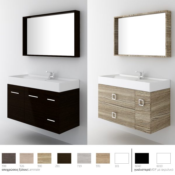 Κρεμαστό έπιπλο μπάνιου Touch 101 – σειρά επίπλων Minimal. Ένα έπιπλο μπάνιου, βαρέως τύπου ιδανικό για οικιακή χρήση. Αποτελείται από, κρεμαστή βάση με δύο πόρτες ή δύο πόρτες και δύο συρτάρια ή τέσσερα συρτάρια ή μια πόρτα και δύο συρτάρια, με μηχανισμούς κλεισίματος soft close και νιπτήρα από πορσελάνη. Μπορείτε να ολοκληρώσετε την εικόνα του επίπλου προσθέτοντας καθρέπτη δικής σας επιλογής (ντουλάπι, εταζέρα με ντουλαπάκια ή καθρέπτη με πλαίσιο) και τα πόμολα που ταιριάζουν στο δικό σας μπάνιο. Όλα τα έπιπλα της εταιρείας Orabella μπορούν να πάρουν στήλες μπάνιου επιδαπέδιες ή κρεμαστές για επιπλέον χώρο αποθήκευσης, ενώ υπάρχει δυνατότητα προσθήκης ντουλαπιού πλυντηρίου σε χρώμα δικής σας επιλογής. Διατίθεται σε έξι διαφορετικές αποχρώσεις ξύλου και σε λευκό χρώμα-Laminate καθώς και σε μαύρο και λευκό γυαλιστερό ακρυλικό σε mdf. Κατόπιν επιλογής, μπορεί να συνοδευτεί με γραμμικό φωτιστικό μπάνιου Led.Υλικό επίπλου μελαμίνη με PVC για μεγαλύτερη αντοχή στο χρόνο και σε μεγάλη γκάμα χρωματικών επιλογών. Χρήση μηχανισμών κλεισίματος soft close και blumotion (σε συρτάρια) που φέρουν την υπογραφή της κορυφαίας εταιρείας BLUM. Διατίθεται με ντουλάπι καθρέπτη με δύο πόρτες ή με καθρέπτη εταζέρα που μπορεί να πλαισιωθεί από δύο πρόσθετα ντουλάπια 25 εκατοστών. Ο καθρέπτης Infinity αποτελεί μια τρίτη επιλογή χωρίς αποθηκευτικό χώρο. Ο τελευταίος βγαίνει μόνο σε αποχρώσεις ξύλου Laminate. Συμπεριλαμβάνονται στη βάση δύο, τρείς ή τέσσερεις, χρωμέ λαβές επίπλων, δικής σας επιλογής σε τρία σχέδια, ανάλογα με τη μορφολογία της βάσης. Ενώ υπάρχει δυνατότητα προσθήκης στο πακέτο μαύρων ματ γραμμικών λαβών, κατόπιν επιλογής. Στην περίπτωση τεσσάρων συρταριών ή μιας πόρτας και δύο συρταριών μπορείτε να επιλέξετε ανάμεσα στα πόμολα Μ1, Μ4 ή Μ5 ή σε μαύρο πόμολο M1. Σε βάση με δύο πόρτες μπορεί να τοποθετηθούν πόμολα χρωμέ, γραμμικά, L1, L2 ή L3 ή μαύρο ματ L1. Και τέλος στην περίπτωση βάσης με δύο πόρτες – δύο συρτάρια τα πόμολα σε χρωμέ απόχρωση είναι φιξαρισμένα, γραμμικά (S1,M1) αλλά μπορείτε να αλλάξετε την εικόνα του επίπλου σας προσθέτοντας μαύρα ματ πόμολα (S1,M1). Ομοίως μπορείτε να συνδυάσετε φωτιστικό επίπλου σε χρωμέ ή μαύρη απόχρωση. Η συνολική σύνθεση του επίπλου αποστέλλεται συναρμολογημένη σε 3 τεμάχια (βάση, νιπτήρας και καθρέπτης) και σε περίπτωση που επιλέξετε στήλες μπάνιου για να αυξήσετε τους αποθηκευτικούς χώρους στο μπάνιο σας, αυτές παραδίδονται συναρμολογημένες. Κατόπιν επιλογής, η σύνθεση μπορεί να συνοδευτεί με γραμμικό φωτιστικό μπάνιου Led 40 ή 60 εκατοστά ισχύος 8 και 12 watt αντιστοίχως, σε χρωμέ ή και μαύρο ματ χρώμα. Στην τιμή του νιπτήρα δεν συμπεριλαμβάνεται η μπαταρία και η βαλβίδα του νιπτήρα, μπορείτε να προσθέσετε ορειχάλκινη, βαλβίδα κλικ-κλακ για νιπτήρες με υπερχείλιση. Ομοίως μπορείτε να προσθέσετε μπαταρία νιπτήρος που φέρει την υπογραφή κορυφαίων εταιρειών στο σχεδιασμό ειδών υγιεινής, όπως Pentagono, Orabella by Armando Vicario και Orabella.