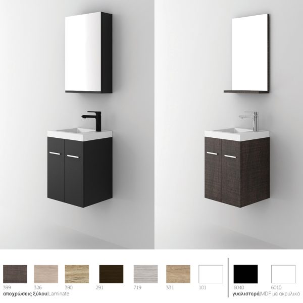 Κρεμαστό έπιπλο μπάνιου Type 40 – σειρά επίπλων Compact. Ένα μικρό έπιπλο ιδανικό για πολύ μικρά μπάνια. Αποτελείται από, κρεμαστή βάση με δύο πόρτες με μηχανισμούς κλεισίματος soft close και νιπτήρα από πορσελάνη. Μπορείτε να ολοκληρώσετε την εικόνα του επίπλου προσθέτοντας καθρέπτη δικής σας επιλογής (ντουλάπι ή εταζέρα) και τα πόμολα που ταιριάζουν στο δικό σας μπάνιο. Όλα τα έπιπλα της εταιρείας Orabella μπορούν να πάρουν στήλες μπάνιου επιδαπέδιες ή κρεμαστές για επιπλέον χώρο αποθήκευσης, ενώ υπάρχει δυνατότητα προσθήκης ντουλαπιού πλυντηρίου σε χρώμα δικής σας επιλογής. Διατίθεται σε έξι διαφορετικές αποχρώσεις ξύλου και σε λευκό χρώμα Laminate καθώς και σε μαύρο και λευκό γυαλιστερό ακρυλικό σε mdf. Κατόπιν επιλογής, μπορεί να συνοδευτεί με γραμμικό φωτιστικό μπάνιου Led.Υλικό επίπλου μελαμίνη με PVC για μεγαλύτερη αντοχή στο χρόνο και σε μεγάλη γκάμα χρωματικών επιλογών. Χρήση μηχανισμών κλεισίματος soft close, που φέρουν την υπογραφή της κορυφαίας εταιρείας BLUM. Διατίθεται με ντουλάπι καθρέπτη με μία πόρτα, όπου εσείς μπορείτε να επιλέξετε δεξί ή αριστερό άνοιγμα, ή με καθρέπτη εταζέρα. Συμπεριλαμβάνονται στη βάση δύο, χρωμέ λαβές επίπλων, δικής σας επιλογής σε τρία σχέδια (M1, M4, M5). Ενώ υπάρχει δυνατότητα προσθήκης στο πακέτο μαύρων ματ γραμμικών λαβών κατόπιν επιλογής (Μ1). Ομοίως μπορείτε να συνδυάσετε φωτιστικό επίπλου σε χρωμέ ή μαύρη απόχρωση. Η συνολική σύνθεση του επίπλου αποστέλλεται συναρμολογημένη σε 3 τεμάχια (βάση, νιπτήρας και καθρέπτης) και σε περίπτωση που επιλέξετε στήλες μπάνιου για να αυξήσετε τους αποθηκευτικούς χώρους στο μπάνιο σας, αυτές παραδίδονται, επίσης, συναρμολογημένες. Κατόπιν επιλογής, η σύνθεση μπορεί να συνοδευτεί με γραμμικό φωτιστικό μπάνιου Led 40 ή 60 εκατοστά ισχύος 8 και 12 watt αντιστοίχως, σε χρωμέ ή και μαύρο ματ χρώμα. Στην τιμή του νιπτήρα δεν συμπεριλαμβάνεται η μπαταρία και η βαλβίδα του νιπτήρα, μπορείτε να προσθέσετε ορειχάλκινη, βαλβίδα κλικ-κλακ για νιπτήρες με υπερχείλιση. Ομοίως μπορείτε να προσθέσετε μπαταρία νιπτήρος που φέρει την υπογραφή κορυφαίων εταιρειών στο σχεδιασμό ειδών υγιεινής, όπως Pentagono, Orabella by Armando Vicario και Orabella.