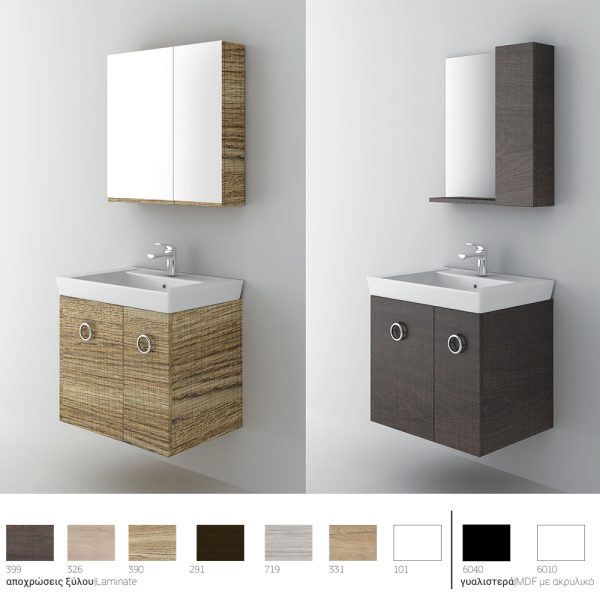 Κρεμαστό έπιπλο μπάνιου Vanity 65 – σειρά επίπλων Alternative. Ένα έπιπλο μπάνιου, βαρέως τύπου ιδανικό για οικιακή χρήση. Αποτελείται από, κρεμαστή βάση με δύο πόρτες με μηχανισμούς κλεισίματος soft close και νιπτήρα από πορσελάνη. Η βάση διατίθεται και σε επιδαπέδια (Vanity 65 Long). Μπορείτε να ολοκληρώσετε την εικόνα του επίπλου προσθέτοντας καθρέπτη δικής σας επιλογής (ντουλάπι, εταζέρα με ντουλαπάκι ή καθρέπτη με πλαίσιο) και τα πόμολα που ταιριάζουν στο δικό σας μπάνιο. Όλα τα έπιπλα της εταιρείας Orabella μπορούν να πάρουν στήλες μπάνιου επιδαπέδιες ή κρεμαστές για επιπλέον χώρο αποθήκευσης, ενώ υπάρχει δυνατότητα προσθήκης ντουλαπιού πλυντηρίου σε χρώμα δικής σας επιλογής. Διατίθεται σε έξι διαφορετικές αποχρώσεις ξύλου και σε λευκό χρώμα- Laminate καθώς και σε μαύρο και λευκό γυαλιστερό και ματ ακρυλικό σε mdf. Κατόπιν επιλογής, μπορεί να συνοδευτεί με γραμμικό φωτιστικό μπάνιου Led.Υλικό επίπλου μελαμίνη με PVC για μεγαλύτερη αντοχή στο χρόνο και σε μεγάλη γκάμα χρωματικών επιλογών. Χρήση μηχανισμών κλεισίματος soft close, που φέρουν την υπογραφή της κορυφαίας εταιρείας BLUM. Διατίθεται με ασύμμετρο ντουλάπι καθρέπτη με δύο πόρτες ή με καθρέπτη εταζέρα που μπορεί να πλαισιωθεί από ένα πρόσθετο ντουλάπι 25 εκατοστών. Ο καθρέπτης Infinity αποτελεί μια τρίτη επιλογή χωρίς αποθηκευτικό χώρο. Ο τελευταίος βγαίνει μόνο σε αποχρώσεις ξύλου Laminate. Συμπεριλαμβάνονται στη βάση δύο, χρωμέ λαβές επίπλων, δικής σας επιλογής σε τρία σχέδια (M1, M4, M5). Ενώ υπάρχει δυνατότητα προσθήκης στο πακέτο μαύρων ματ γραμμικών λαβών κατόπιν επιλογής (Μ1). Ομοίως μπορείτε να συνδυάσετε φωτιστικό επίπλου σε χρωμέ ή μαύρη απόχρωση. Η συνολική σύνθεση του επίπλου αποστέλλεται συναρμολογημένη σε 3 τεμάχια (βάση, νιπτήρας και καθρέπτης) και σε περίπτωση που επιλέξετε στήλες μπάνιου για να αυξήσετε τους αποθηκευτικούς χώρους στο μπάνιο σας, αυτές παραδίδονται συναρμολογημένες. Κατόπιν επιλογής, η σύνθεση μπορεί να συνοδευτεί με γραμμικό φωτιστικό μπάνιου Led 40 ή 60 εκατοστά ισχύος 8 και 12 watt αντιστοίχως, σε χρωμέ ή και μαύρο ματ χρώμα. Στην τιμή του νιπτήρα δεν συμπεριλαμβάνεται η μπαταρία και η βαλβίδα του νιπτήρα, μπορείτε να προσθέσετε ορειχάλκινη, βαλβίδα κλικ-κλακ για νιπτήρες με υπερχείλιση. Ομοίως μπορείτε να προσθέσετε μπαταρία νιπτήρος που φέρει την υπογραφή κορυφαίων εταιρειών στο σχεδιασμό ειδών υγιεινής, όπως Pentagono, Orabella by Armando Vicario και Orabella.