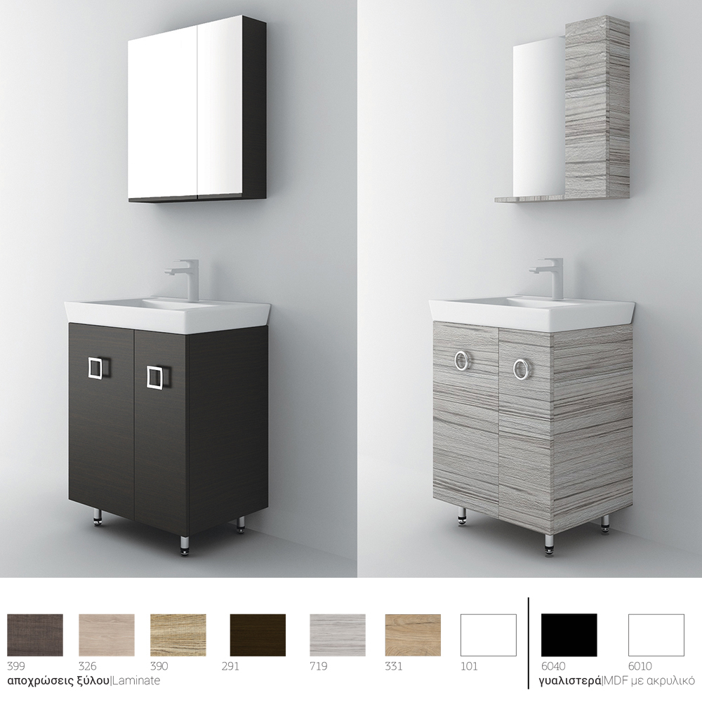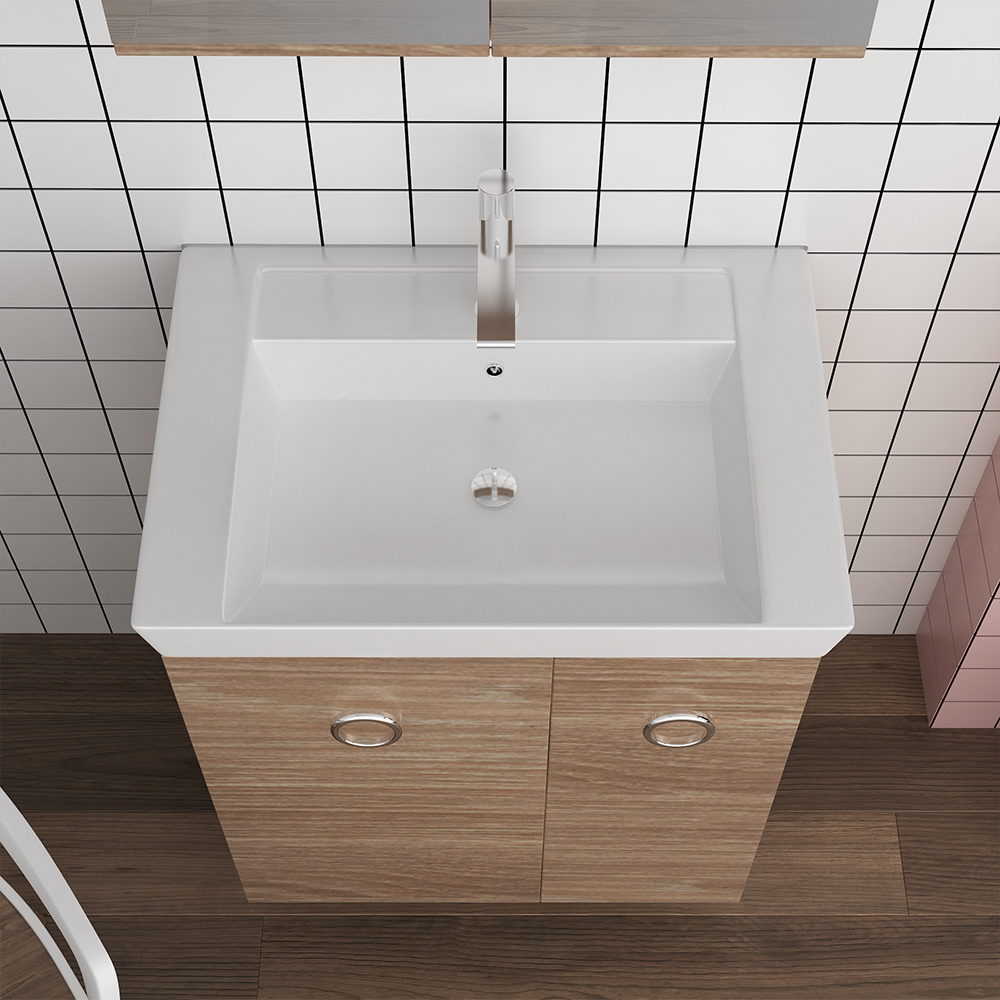 Επιδαπέδιο έπιπλο μπάνιου Vanity 65 Long – σειρά επίπλων Alternative. Ένα έπιπλο μπάνιου, βαρέως τύπου ιδανικό για οικιακή χρήση. Αποτελείται από, επιδαπέδια βάση με δύο πόρτες με μηχανισμούς κλεισίματος soft close και νιπτήρα από πορσελάνη. Μπορείτε να ολοκληρώσετε την εικόνα του επίπλου προσθέτοντας καθρέπτη δικής σας επιλογής (ντουλάπι, εταζέρα με ντουλαπάκι ή καθρέπτη με πλαίσιο) και τα πόμολα που ταιριάζουν στο δικό σας μπάνιο. Όλα τα έπιπλα της εταιρείας Orabella μπορούν να πάρουν στήλες μπάνιου επιδαπέδιες ή κρεμαστές για επιπλέον χώρο αποθήκευσης, ενώ υπάρχει δυνατότητα προσθήκης ντουλαπιού πλυντηρίου σε χρώμα δικής σας επιλογής. Διατίθεται σε έξι διαφορετικές αποχρώσεις ξύλου και σε λευκό χρώμα- Laminate καθώς και σε μαύρο και λευκό γυαλιστερό και ματ ακρυλικό σε mdf. Κατόπιν επιλογής, μπορεί να συνοδευτεί με γραμμικό φωτιστικό μπάνιου Led.
