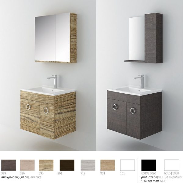Υλικό επίπλου μελαμίνη με PVC ή MDF με ακρυλικό (γυαλιστερό) ή MDF (ματ) για μεγαλύτερη αντοχή στο χρόνο και σε μεγάλη γκάμα χρωματικών επιλογών. Χρήση μηχανισμών κλεισίματος soft close, που φέρουν την υπογραφή της κορυφαίας εταιρείας BLUM. Διατίθεται με ντουλάπι καθρέπτη με δύο πόρτες ή με καθρέπτη εταζέρα που μπορεί να πλαισιωθεί από ένα πρόσθετο ντουλάπι 20 εκατοστών. Ο καθρέπτης Infinity αποτελεί μια τρίτη επιλογή χωρίς αποθηκευτικό χώρο. Ο τελευταίος βγαίνει μόνο σε αποχρώσεις ξύλου Laminate. Συμπεριλαμβάνονται στη βάση δύο, χρωμέ λαβές επίπλων, δικής σας επιλογής σε τρία σχέδια (M1, M4, M5). Ενώ υπάρχει δυνατότητα προσθήκης στο πακέτο μαύρων ματ γραμμικών λαβών κατόπιν επιλογής (Μ1). Ομοίως μπορείτε να συνδυάσετε φωτιστικό επίπλου σε χρωμέ ή μαύρη απόχρωση. Η συνολική σύνθεση του επίπλου αποστέλλεται συναρμολογημένη σε 3 τεμάχια (βάση, νιπτήρας και καθρέπτης) και σε περίπτωση που επιλέξετε στήλες μπάνιου για να αυξήσετε τους αποθηκευτικούς χώρους στο μπάνιο σας, αυτές παραδίδονται συναρμολογημένες. Κατόπιν επιλογής, η σύνθεση μπορεί να συνοδευτεί με γραμμικό φωτιστικό μπάνιου Led 40 ή 60 εκατοστά ισχύος 8 και 12 watt αντιστοίχως, σε χρωμέ ή και μαύρο ματ χρώμα. Εναλλακτικά μπορείτε να επιλέξετε καθρέπτη με κρυφό φωτισμό LED. Στην τιμή του νιπτήρα δεν συμπεριλαμβάνεται η μπαταρία και η βαλβίδα του νιπτήρα, μπορείτε να προσθέσετε ορειχάλκινη, βαλβίδα κλικ-κλακ για νιπτήρες με υπερχείλιση. Ομοίως μπορείτε να προσθέσετε μπαταρία νιπτήρος που φέρει την υπογραφή κορυφαίων εταιρειών στο σχεδιασμό ειδών υγιεινής, όπως Pentagono, Orabella by Armando Vicario και Orabella.