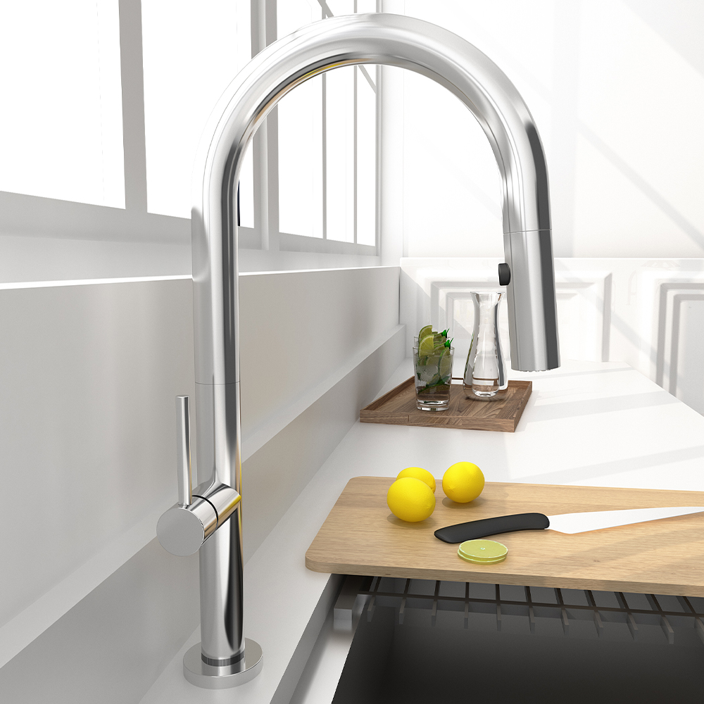 Μπαταρία κουζίνας με αποσπώμενο, συρόμενο ντουζ δύο ροών, σπιράλ 45 cm βαρέως τύπου, σύμφωνα με τα standards DVGW, κατάλληλο για πόσιμο νερό και με μεγάλη αντοχή σε αυξομειώσεις της πίεσης. Οικονομία στο νερό μέχρι και 30% σε σχέση με τις κοινές μπαταρίες χάρη στον ειδικό σχεδιασμό και το φίλτρο της μπαταρίας. Πολύ χαμηλό επίπεδο θορύβου κατά τη χρήση. Άριστη ποιότητα κατασκευής, που εγγυάται ευκολία στο καθάρισμα και λάμψη για πολλά χρόνια χρήσης. Όλα τα επιμέρους υλικά κατασκευής, όπως λάστιχα, φλάντζες, μηχανισμοί είναι πιστοποιημένα και κατάλληλα για πόσιμο νερό. Πολύ εύκολη τοποθέτηση χάρη στο σύστημα easyfix. Συνοδεύεται από 5-ετή γραπτή εργοστασιακή εγγύηση και υποστηρίζεται από πλήρη γκάμα ανταλλακτικών.