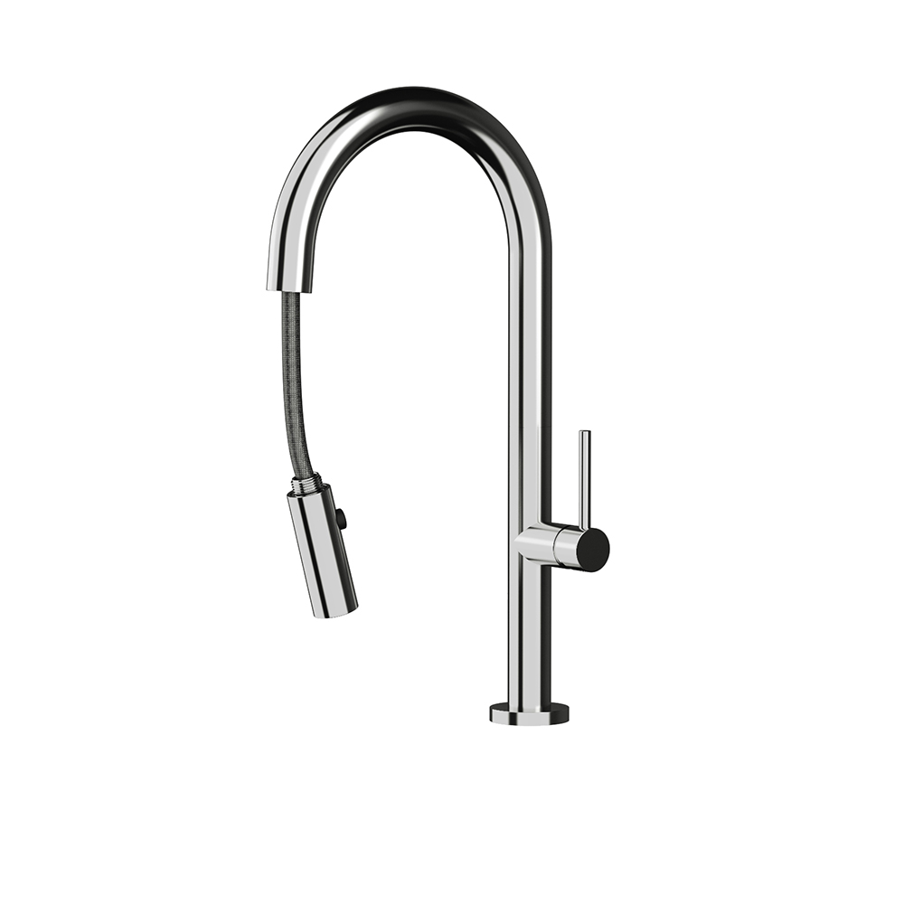Μπαταρία κουζίνας Orabella, Vertigo με αποσπώμενο, συρόμενο ντουζ δύο ροών με δύο λειτουργίες shower και spray. Πρόκειται για μια μοντέρνα μπαταρία πάγκου, η οποία είναι κατασκευασμένη από τον οίκο Orabella, από υψηλής ποιότητας ορείχαλκο. Διατίθεται σε δύο χρωματικές επιλογές: χρωμέ και μαύρο ματ.