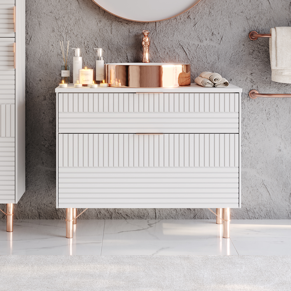 Πάγκος FIORE Λευκό MDF 18mm Λάκα 85 S3FIO085WHM 87x51x72cm Αποτελείται από: Πάγκος FIORE Λευκός 87 επιδαπέδιος σε ματ λάκα και υλικό mdf. Διαθέτει δύο συρτάρια για την τοποθέτηση και οργάνωση αντικειμένων. Νιπτήρας κεραμικός χρώματος ροζ-χρυσό, κορυφαίας κατασκευής και υψηλής αισθητικής. Διαθέτει οπή υπερχείλισης. Ματ λάκα 2 συστατικών σε MDF. O Πάγκος FIORE σε Λευκή απόχρωση αποτελεί ένα στυλάτο και μοντέρνο κομμάτι με εργονομικό σχεδιασμό αλλά και λειτουργικότητα. Προσαρμόζεται σε κάθε τύπο μπάνιου. •Πρακτικοί αποθηκευτικοί χώροι •Μηχανισμοί για απαλό και αθόρυβο κλείσιμο •Εύκολη τοποθέτηση •Ετοιμοπαράδοτα προϊόντα Δεν συμπεριλαμβάνονται η μπαταρία και τα διακοσμητικά. Διατίθεται έτοιμο συναρμολογημένο.