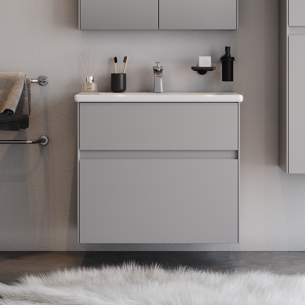 Πάγκος MALAGA Γκρι MDF 18mm Λάκα 80 3SMAL080GRM 80×45.5x72cm Αποτελείται από: Πάγκος MALAGA Γκρι 80 κρεμαστός σε υλικό mdf. Διαθέτει δύο συρτάρια για την τοποθέτηση και οργάνωση αντικειμένων. Νιπτήρας κεραμικός χρώματος λευκού, κορυφαίας κατασκευής και υψηλής αισθητικής. Διαθέτει οπή υπερχείλισης. Ματ λάκα 2 συστατικών σε MDF. Ο Πάγκος MALAGA Γκρι απόχρωση αποτελεί ένα στυλάτο και μοντέρνο κομμάτι με εργονομικό σχεδιασμό αλλά και λειτουργικότητα. Προσαρμόζεται σε κάθε τύπο μπάνιου. •Πρακτικοί αποθηκευτικοί χώροι •Μηχανισμοί για απαλό και αθόρυβο κλείσιμο •Εύκολη τοποθέτηση •Ετοιμοπαράδοτα προϊόντα Δεν συμπεριλαμβάνονται η μπαταρία και τα διακοσμητικά. Διατίθεται έτοιμο συναρμολογημένο.