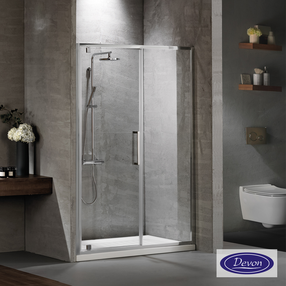 Ανοιγόμενη πόρτα αντιστρεφόμενη με 1 σταθερό φύλλο DEVON PRIMUS PLUS. Διαστάσεις: 107-111 / ύψος 195 εκ. Άνοιγμα εισόδου 57εκ. Κρύσταλλο ασφαλείας Clear (διαφανές) 6 χιλ. με επεξεργασία Clean Glass