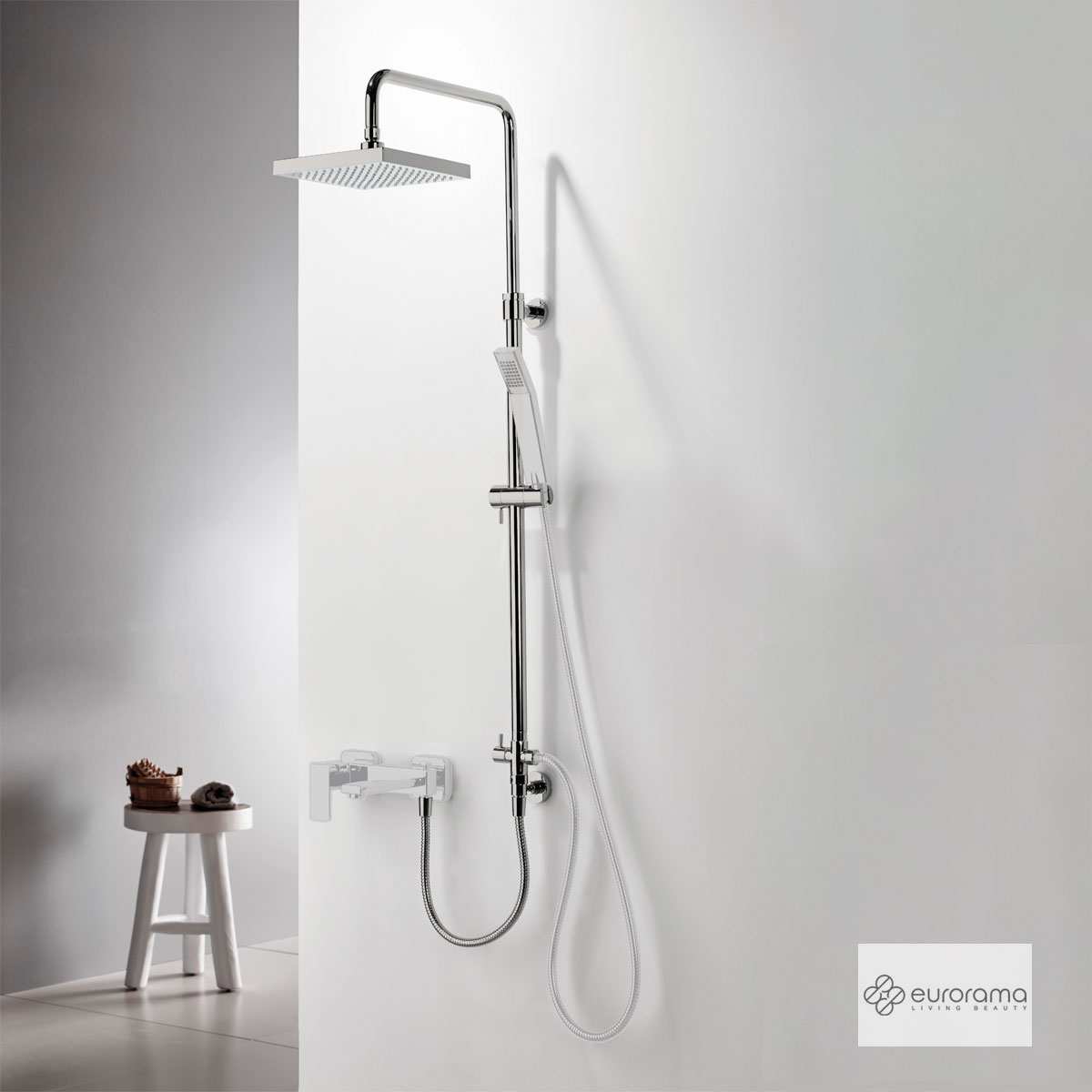 Κολώνα για σύνδεση με μπαταρία λουτρού. Ρυθμιζόμενο ύψος 83-144 εκ. με ανακλινόμενη κεφαλή anticalcare 20×20 εκ., εκτροπέα, στήριγμα τηλεφώνου & άθραυστο σπιράλ 60 εκ., Eurorama Ιταλίας