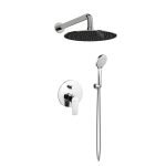 Οι μπαταρίες μπάνιου της σειράς VK αποτελούν ιδανική λύση για όλα τα μπάνια χάρη στην υψηλή ποιότητα κατασκευής τους, που εγγυάται ευκολία στο καθάρισμα και λάμψη για πολλά χρόνια χρήσης. Η VK φέρει την υπογραφή της εταιρείας Pentagono και κατασκευάζεται από υψηλής ποιότητας ορείχαλκο που προορίζεται τόσο για οικιακή, όσο και για επαγγελματική χρήση. Το shower set αυτής της σειράς αποτελείται από μπαταρία λουτρού, 2-σημείων VK η οποία συνδυάζεται με κεφαλή ντουζ (Ø250), παροχή σπιράλ με στήριγμα και μοντέρνο τηλέφωνο ντουζ με ορειχάλκινο Smooth σπιράλ. Διατίθεται σε συνδιασμό με μπαταρία νιπτήρος με πλακέτα VK κατόπιν επιλογής.Μπαταρία λουτρού, εντοιχισμού, 2-σημείων χρωμέ με άριστη ποιότητα επινικέλωσης 5 στρωμάτων, που εγγυάται ευκολία στο καθάρισμα και λάμψη για πολλά χρόνια. Στρόγγυλος, επιτοίχιος βραχίονας κεφαλής ντουζ 30 εκ., με στρόγγυλη ροζέτα που κατασκευάζεται από υψηλής ποιότητας ορείχαλκο και κεφαλή ντουζ στρόγγυλη Ø250 από ανοξείδωτο ατσάλι. Συνοδεύονται από επιτοίχια παροχή με στήριγμα τηλεφώνου από ορείχαλκο και μοντέρνο τηλέφωνο ντουζ με στρόγγυλη κεφαλή 3-θέσεων, σε χρωμέ φινίρισμα σετ με Smooth χρωμέ, ορειχάλκινο σπιράλ. Και μπαταρία νιπτήρος, εντοιχισμού με πλακέτα. Οικονομία στο νερό μέχρι και 30% σε σχέση με τις κοινές μπαταρίες χάρη στον ειδικό σχεδιασμό και το φίλτρο της μπαταρίας. Πολύ χαμηλό επίπεδο θορύβου κατά τη χρήση. Όλα τα επιμέρους υλικά κατασκευής, όπως λάστιχα, φλάντζες, μηχανισμοί είναι πιστοποιημένα και κατάλληλα για πόσιμο νερό. Συνοδεύεται από 5-ετή γραπτή εργοστασιακή εγγύηση και υποστηρίζεται από πλήρη γκάμα ανταλλακτικών.