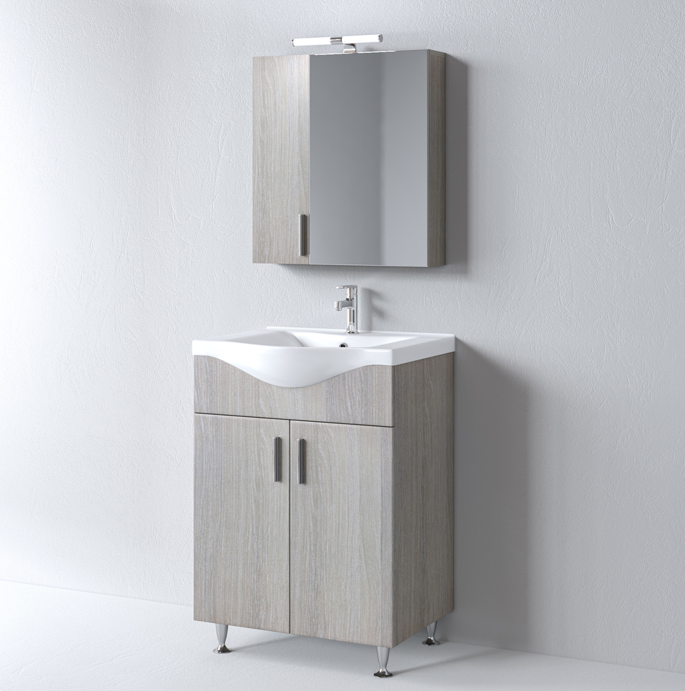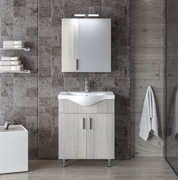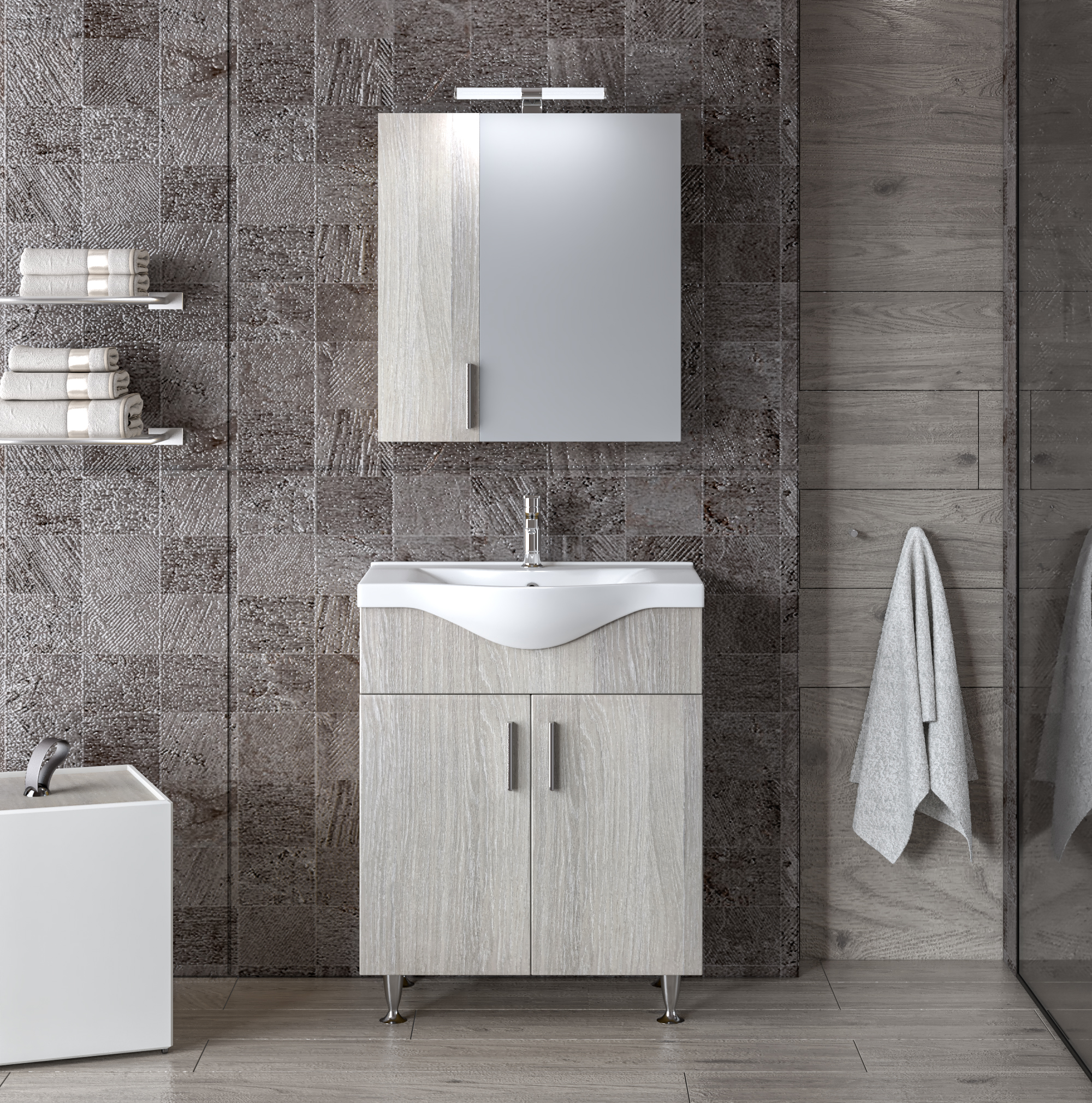 Σετ Έπιπλο Μπάνιου SIENA HARMONY NEW 65 9SSI065HN0W Αποτελείται από: Πάγκος με τέσσερα ποδαράκια SIENA 65 HARMONY NEW. Διαθέτει ευρύχωρο ντουλάπι με δύο πόρτες. Περιλαμβάνει εσωτερικό ράφι που σας προσφέρει έξτρα χώρο για την τοποθέτηση και οργάνωση των αντικειμένων σας. Καθρέφτης SIENA 60 HARMONY NEW. Περιλαμβάνει πρόσοψη καθρέφτη που ανοίγει προς τα δεξιά και μια μικρότερη ξύλινη πόρτα στο αριστερό πλαϊνό μέρος, στον ίδιο χρωματισμό με τον καθρέφτη, που ανοίγει προς τα αριστερά. Το μικρό ντουλαπάκι διαθέτει ένα ράφι που σας προσφέρει έξτρα αποθηκευτικό χώρο. Το μεγάλο ντουλάπι διαθέτει επίσης εσωτερικό ράφι για την τοποθέτηση των φαρμάκων και αντικειμένων καθημερινής χρήσης. Εξαιρετικός Νιπτήρας BASIC 65 σε μοντέρνο γεωμετρικό σχεδιασμό κορυφαίας ποιότητας, σύγχρονης κατασκευής και υψηλής αισθητικής με γυαλιστερή πορσελάνινη υφή. Διαθέτει οπή υπερχείλισης. Μελαμίνη 16mm πάχος To Σετ Έπιπλο Μπάνιου Siena στην απόχρωση Harmony New χαρακτηρίζεται από τον αισθητικό και λειτουργικό του χαρακτήρα. Συνδυάζει την όψη του ξύλου με τις νέες τάσεις στο χρώμα και δίνει ένα άψογο διαχρονικό αποτέλεσμα. •Πρακτικοί αποθηκευτικοί χώροι •Μηχανισμοί για απαλό και αθόρυβο κλείσιμο •Εύκολη τοποθέτηση •Ετοιμοπαράδοτα προϊόντα Δεν συμπεριλαμβάνονται το φωτιστικό και η μπαταρία. Διατίθεται έτοιμο συναρμολογημένο.