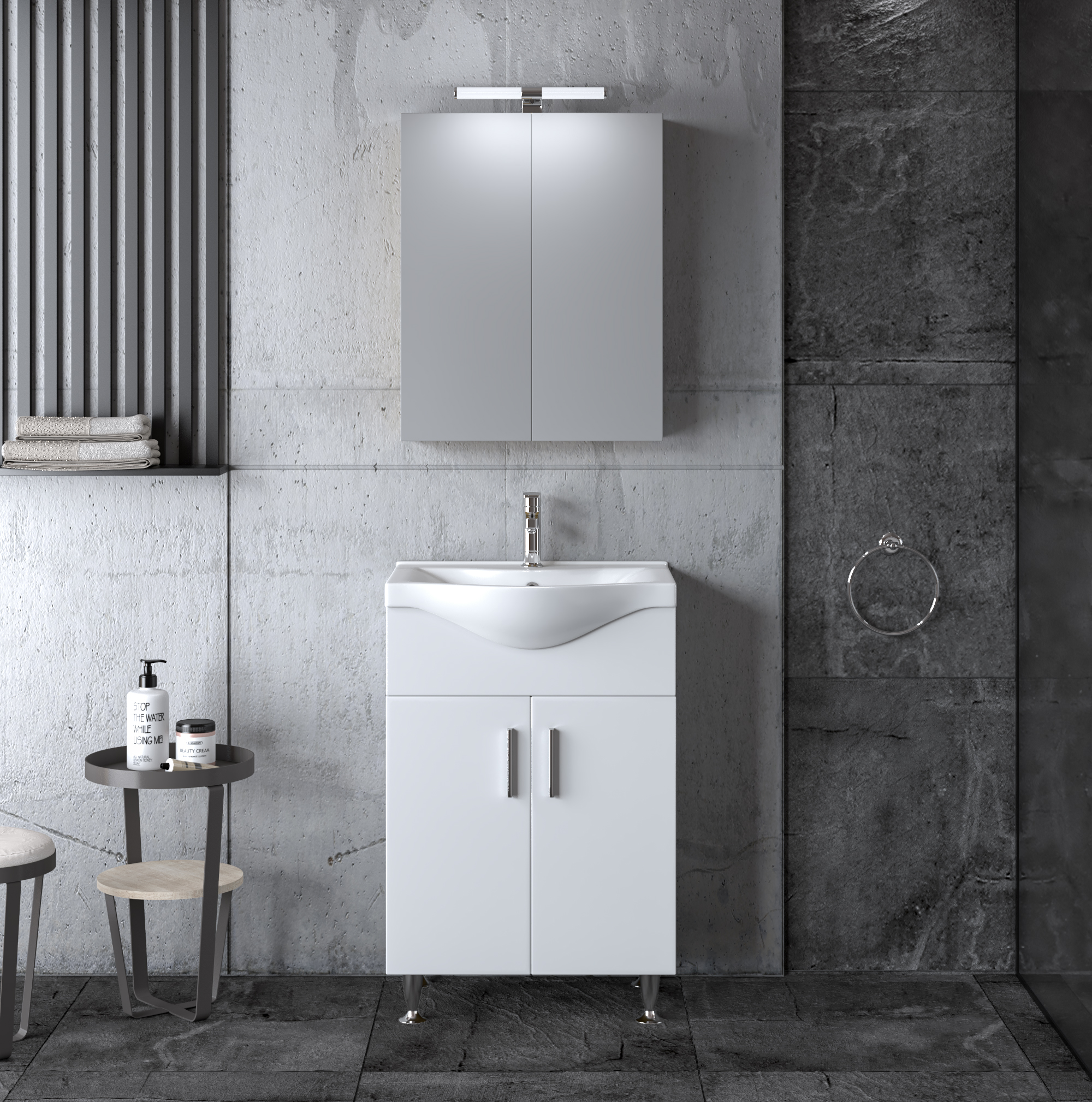 Σετ Έπιπλο Μπάνιου SIENA WHITE 55 9SSI055GL0W Πάγκο 51x34x83cm Αποτελείται από: Πάγκος με τέσσερα ποδαράκια 55. Διαθέτει ευρύχωρο ντουλάπι με δύο πόρτες. Περιλαμβάνει εσωτερικό ράφι που σας προσφέρει έξτρα χώρο για την τοποθέτηση και οργάνωση των αντικειμένων σας. Καθρέφτης 52. Η πρόσοψή του αποτελείται από μεγάλο καθρέφτη με δύο πόρτες προσθέτοντας στην προοπτική του χώρου σας. Περιλαμβάνει εσωτερικό κρυφό ντουλάπι με ράφι για την τοποθέτηση των αντικειμένων καθημερινής χρήσης. Νιπτήρας BASIC 65 από λευκή πορσελάνη κορυφαίας ποιότητας και υψηλής αντοχής και αισθητικής. Διαθέτει οπή υπερχείλισης. Μελαμίνη 16mm πάχος Το συγκεκριμένο Σετ Έπιπλο Μπάνιου στην απόχρωση Siena White αποτελεί ένα στυλάτο και μοντέρνο κομμάτι! Μετατρέπει το μπάνιο σας σε πραγματικό χώρο χαλάρωσης. Το λευκό γυαλιστερό χρώμα έχει μεγάλη διάρκεια και αντοχή στο χρόνο. •Πρακτικοί αποθηκευτικοί χώροι •Μηχανισμοί για απαλό και αθόρυβο κλείσιμο •Εύκολη τοποθέτηση •Ετοιμοπαράδοτα προϊόντα Δεν συμπεριλαμβάνονται το φωτιστικό και η μπαταρία. Διατίθεται έτοιμο συναρμολογημένο.