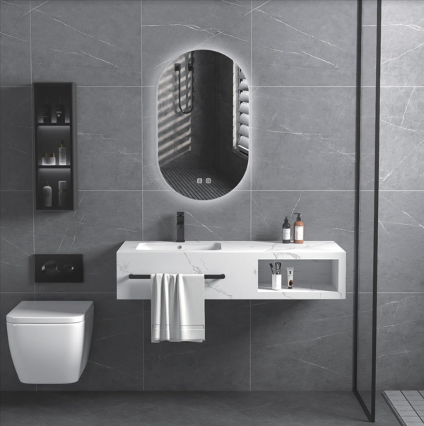 Σετ Επίπλου MARLEN 100 χρ. ΛΕΥΚΟ 9SMAR100WHS Μοναδική αισθητική – Ξεχωριστή ποιότητα Γνωρίστε τη νέα σειρά επίπλων μπάνιου με την εγγύηση ποιότητας MARTIN. Κατασκευασμένο από πυροσυσσωματωμένη πέτρα (sintered stone) και άλλα σύγχρονα υλικά Αποτελείται από: Παγκονίπτηρο διαστάσεων 100x50x30 cm: Με έτοιμη υποδοχή για τη μπαταρία, μαύρο μεταλλικό χερούλι ιδανικό για κρέμασμα πετσέτας και χωνευτό χώρο αποθήκευσης στα δεξιά, διαστάσεις γούρνας, 50×33 cm LED Καθρέφτη σε σχήμα οβάλ διαστάσεων 50×80 cm Εύκολη τοποθέτηση Ετοιμοπαράδοτα προϊόντα Δεν συμπεριλαμβάνονται η μπαταρία και τα διακοσμητικά. Διατίθεται έτοιμο συναρμολογημένο.