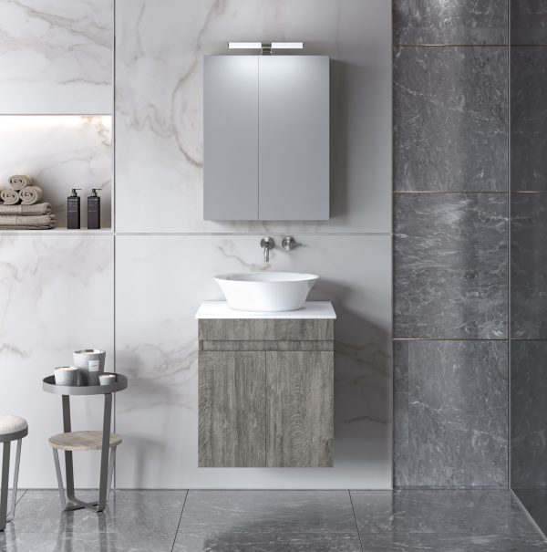 Το Σετ Έπιπλο Μπάνιου Omega Σταχτί αποτελεί ένα στυλάτο και μοντέρνο σετ έπιπλο μπάνιο με εργονομικό σχεδιασμό αλλά και λειτουργικότητα. Ο χρωματισμός του έχει την υφή και την όψη του ξύλου σε αποχρώσεις του σταχτί. Αποτελείται από: Πάγκος κρεμαστός OMEGA Σταχτί 50 με τέλεια εφαρμογή σε όλες τις επιφάνειες με ή χωρίς πλακίδια. Περιλαμβάνει μεγάλο ερμάριο για την εξοικονόμηση επιπλέον αποθηκευτικού χώρου στο μπάνιο. Καθρέφτης OMEGA Σταχτί 50 . Περιλαμβάνει πρόσοψη καθρέφτη με δύο πόρτες. Διαθέτει εσωτερικό ράφι για να οργανώνετε καλύτερα την αποθήκευση χρηστικών αντικειμένων καθημερινής χρήσης για όλα τα μέλη της οικογένειάς σας. Corian Top για κορυφαία ποιότητα και υψηλή αντοχή και αισθητική. Νιπτήρα επικαθούμενο πορσελάνης Διαθέτει οπή υπερχείλισης. Χαρακτηριστικά: Υλικό κατασκευής: Μελαμίνη 16mm πάχος Πρακτικοί αποθηκευτικοί χώροι Με ντουλάπι και εσωτερικό ράφι Μηχανισμοί για απαλό και αθόρυβο κλείσιμο Εύκολη τοποθέτηση Ελληνικής κατασκευής Ετοιμοπαράδοτα προϊόντα Δεν περιλαμβάνει το φωτιστικό, τη μπαταρία, τη στήλη και τα διακοσμητικά. Διατίθεται έτοιμο συναρμολογημένο.