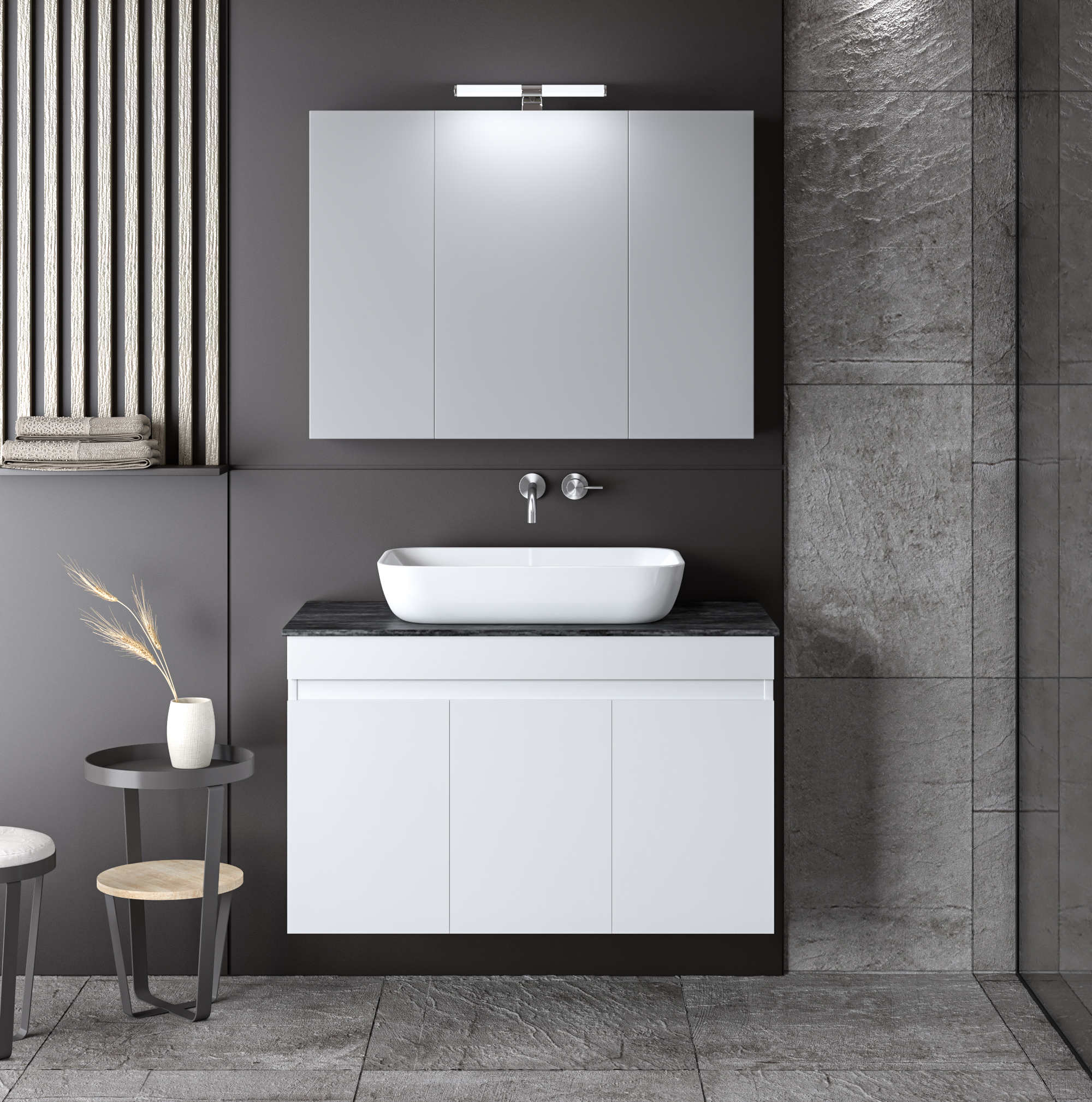 Σετ Επίπλου Μπάνιου Omega Top 90cm χρ. ΛΕΥΚΟ 9SOMT090GLG Το Σετ Έπιπλο Μπάνιου Omega Λευκό αποτελεί ένα στυλάτο και μοντέρνο σετ έπιπλο μπάνιο με εργονομικό σχεδιασμό αλλά και λειτουργικότητα. Ο χρωματισμός του έχει την υφή και την όψη του ξύλου σε αποχρώσεις του λευκό. Αποτελείται από: Πάγκος κρεμαστός OMEGA Λευκό 90 με τέλεια εφαρμογή σε όλες τις επιφάνειες με ή χωρίς πλακίδια. Περιλαμβάνει μεγάλο ερμάριο για την εξοικονόμηση επιπλέον αποθηκευτικού χώρου στο μπάνιο. Καθρέφτης OMEGA Λευκό 90 . Περιλαμβάνει πρόσοψη καθρέφτη με δύο πόρτες. Διαθέτει εσωτερικό ράφι για να οργανώνετε καλύτερα την αποθήκευση χρηστικών αντικειμένων καθημερινής χρήσης για όλα τα μέλη της οικογένειάς σας. Sintered Stone Top για κορυφαία ποιότητα και υψηλή αντοχή και αισθητική. Διατίθεται ατρύπητο για ευεληξια στην τοποθέτηση Νιπτήρα επικαθούμενο πορσελάνης Διαθέτει οπή υπερχείλισης. Χαρακτηριστικά: Υλικό κατασκευής: Μελαμίνη 16mm πάχος Πρακτικοί αποθηκευτικοί χώροι Με ντουλάπι και εσωτερικό ράφι Μηχανισμοί για απαλό και αθόρυβο κλείσιμο Εύκολη τοποθέτηση Ετοιμοπαράδοτα προϊόντα Δεν περιλαμβάνει το φωτιστικό, τη μπαταρία, τη στήλη και τα διακοσμητικά. Διατίθεται έτοιμο συναρμολογημένο.