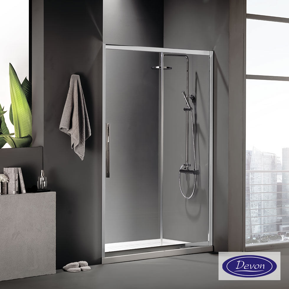Πόρτα ντουζιέρας DEVON FLOW 140 με 1 σταθερό & 1 συρόμενο φύλλο . Διαστάσεις: 137-141 / ύψος 195 εκ. Άνοιγμα εισόδου 60εκ. Κρύσταλλο ασφαλείας Clear (διαφανές) 6 χιλ. με επεξεργασία Clean Glass
