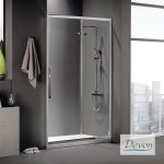 Πόρτα ντουζιέρας DEVON FLOW 150 με 1 σταθερό & 1 συρόμενο φύλλο . Διαστάσεις: 147-151 / ύψος 220 εκ. Άνοιγμα εισόδου 65,5 εκ. Κρύσταλλο ασφαλείας Clear (διαφανές) 6 χιλ. με επεξεργασία Clean Glass