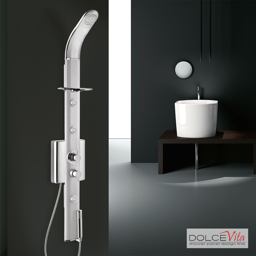 Στήλη ντους-υδρομασάζ SFERA με τηλέφωνο ντους ”anticalcare”, σπιράλ 1,50μ, 3 jet υδρομασάζ κατευθυνόμενα ”anticalcare”, σαπουνοσπογγοθήκη, θερμομικτική μπαταρία με εκτροπέα 3 εξόδων, 6 επιλογές ροής, DROP Ιταλίας