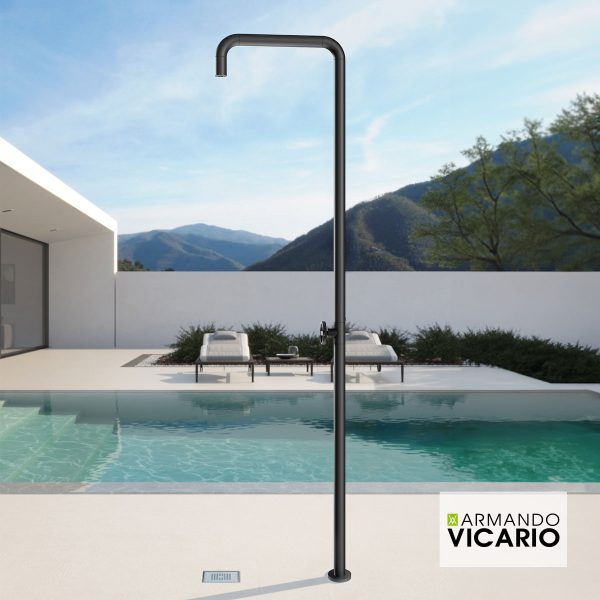 Στήλη ντους εξωτερικού χώρου DIKE ICOS SHOWER ύψους 208 εκ. από ανοξείδωτο χάλυβα Inox AISI316. Με 2 εξόδους καταρράκτη: για πλύση σώματος και πλύση ποδιών. Με δύο επιλογές σύνδεσης παροχής νερού: από λάστιχο κήπου ή δάπεδο. Χωρίς ανάμιξη