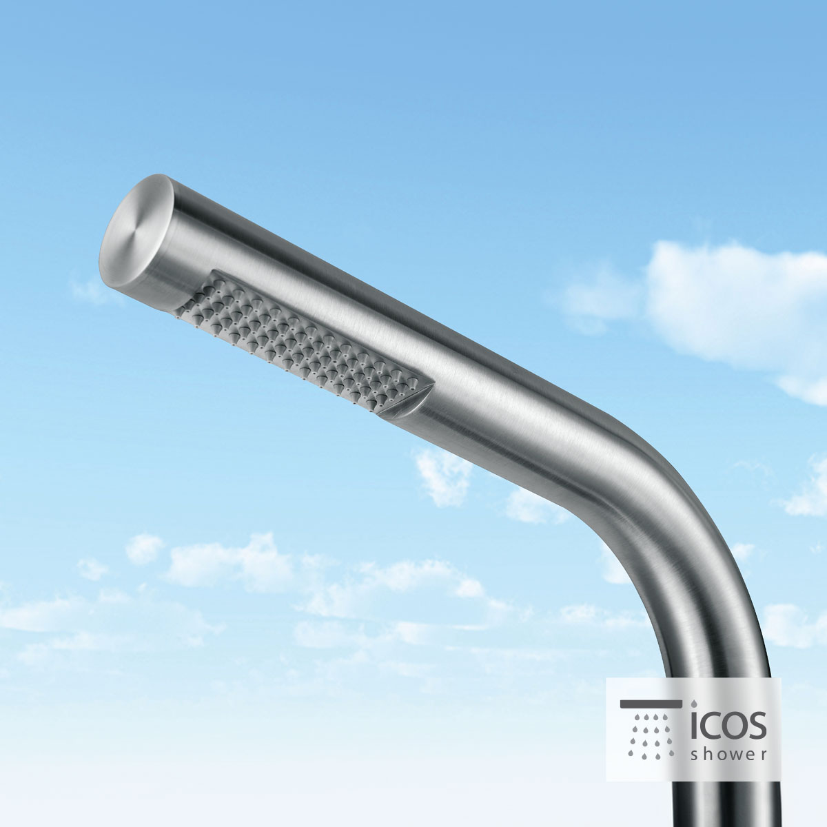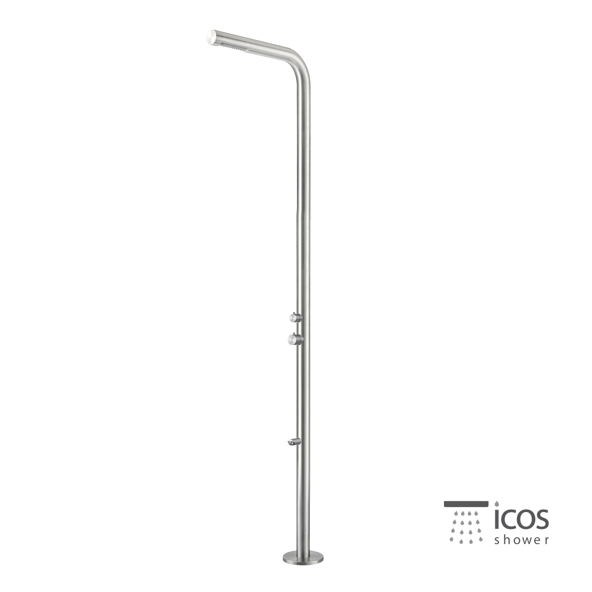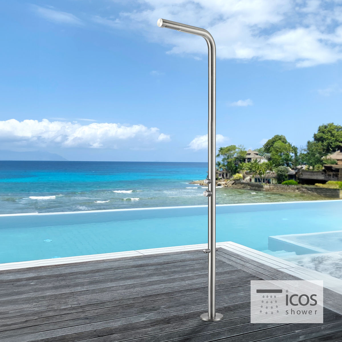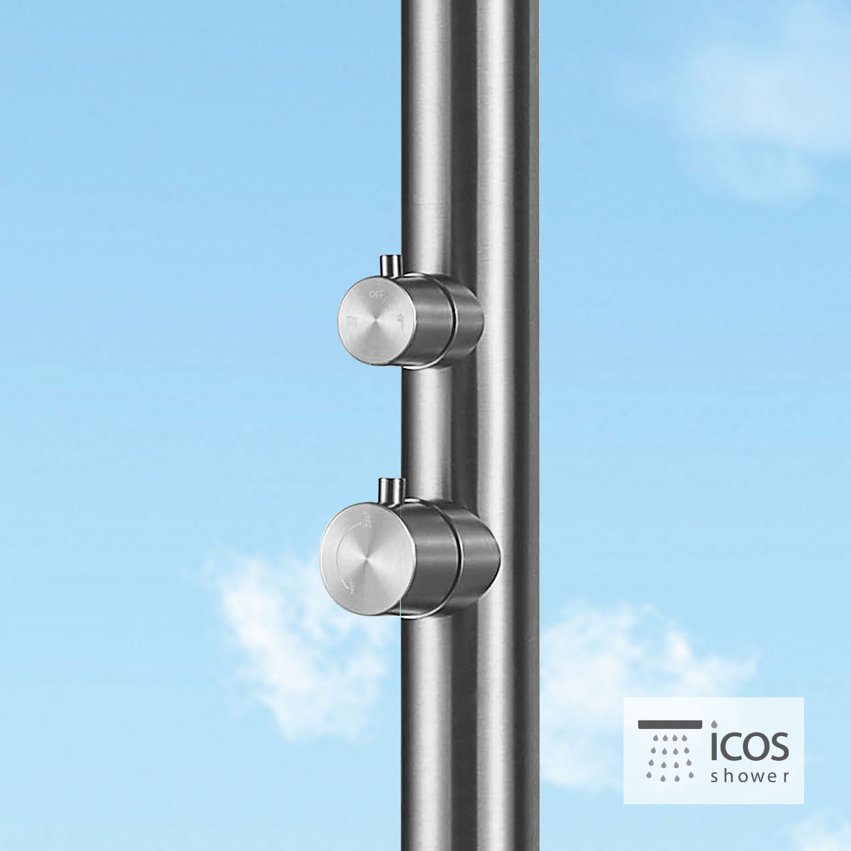 Στήλη ντους θερμομικτική εξωτερικού χώρου DONA ΜΙΧ ICOS SHOWER ύψους 220 εκ. από ανοξείδωτο χάλυβα Inox AISI316. Με 2 εξόδους: ντους κεφαλής και τηλέφωνο. Με ενδοδαπέδια βάση σύνδεσης (control box).