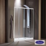 Πόρτα ντουζιέρας DEVON FLOW 160 με 2 σταθερά & 2 συρόμενα φύλλα. Διαστάσεις: 157-161 / ύψος 195 εκ. Άνοιγμα εισόδου 64εκ. Κρύσταλλο ασφαλείας Clear (διαφανές) 6 χιλ. με επεξεργασία Clean Glass