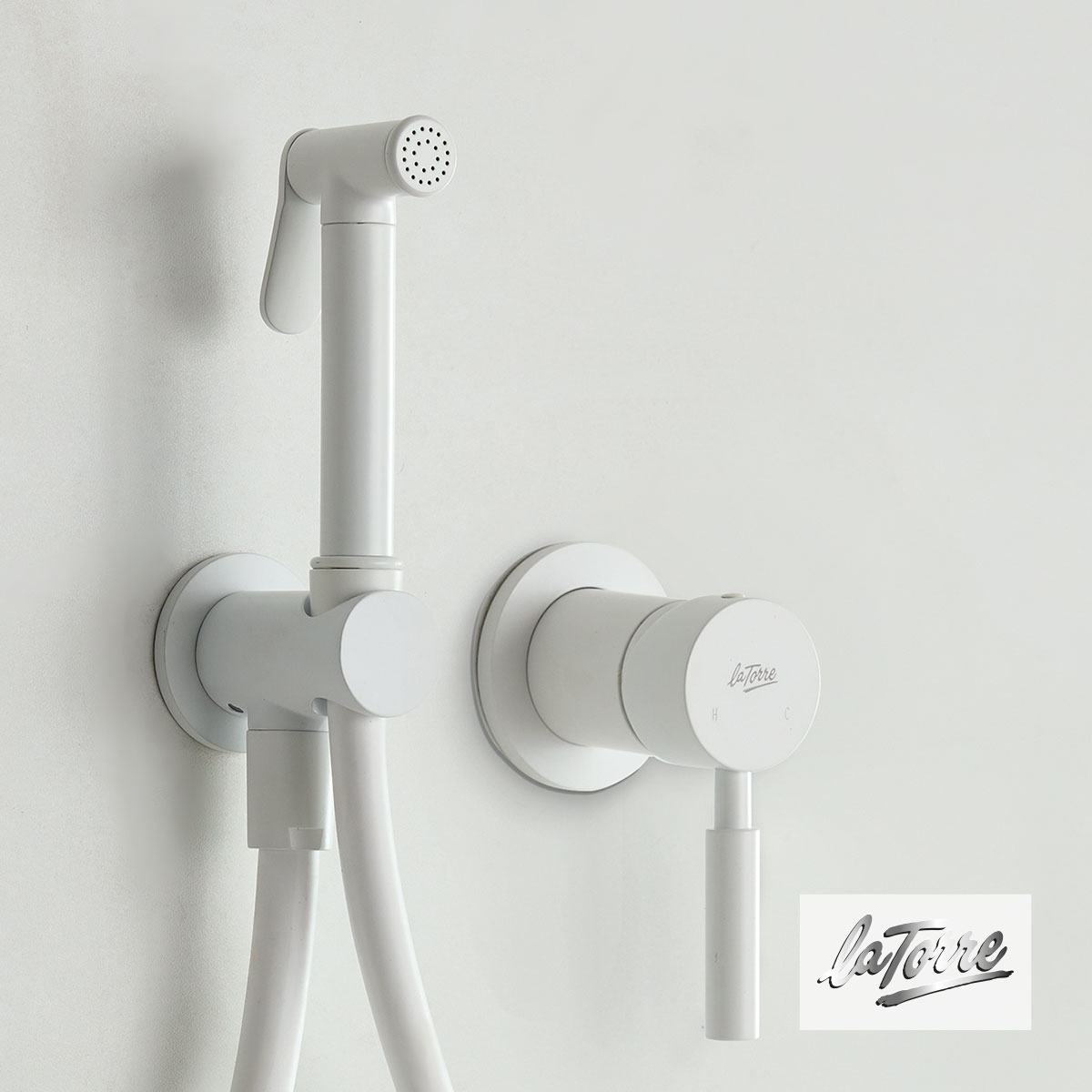 Εντοιχιζόμενος μίκτης Tech Flush-Mix για πλύση υγιεινής ή καθαρισμό λεκάνης, με: παροχή τοίχου με ενσωματωμένο στήριγμα τηλεφώνου, τηλέφωνο με αυτόματο stop & μεταλικό σπιράλ 1m La Torre Ιταλίας